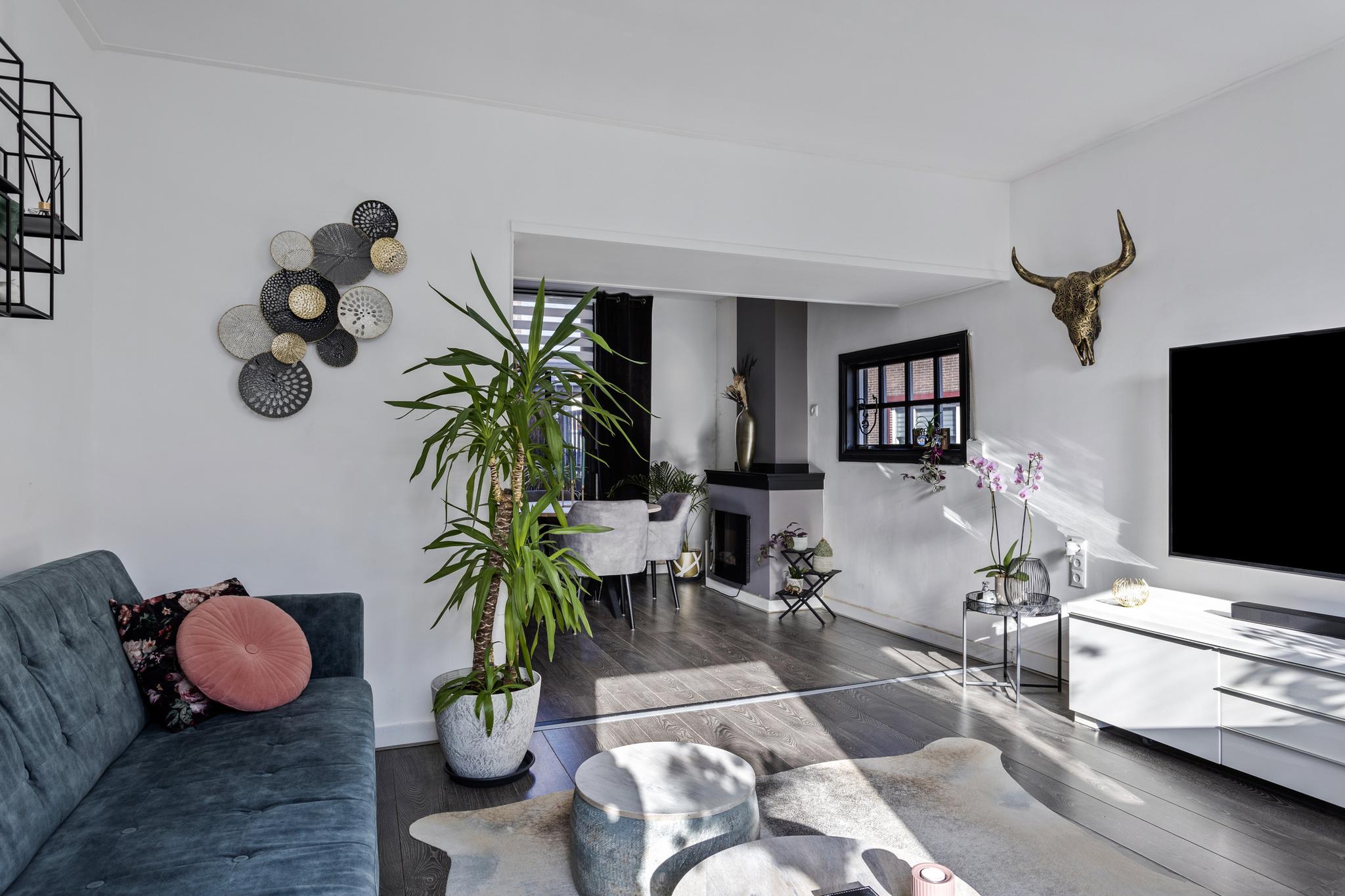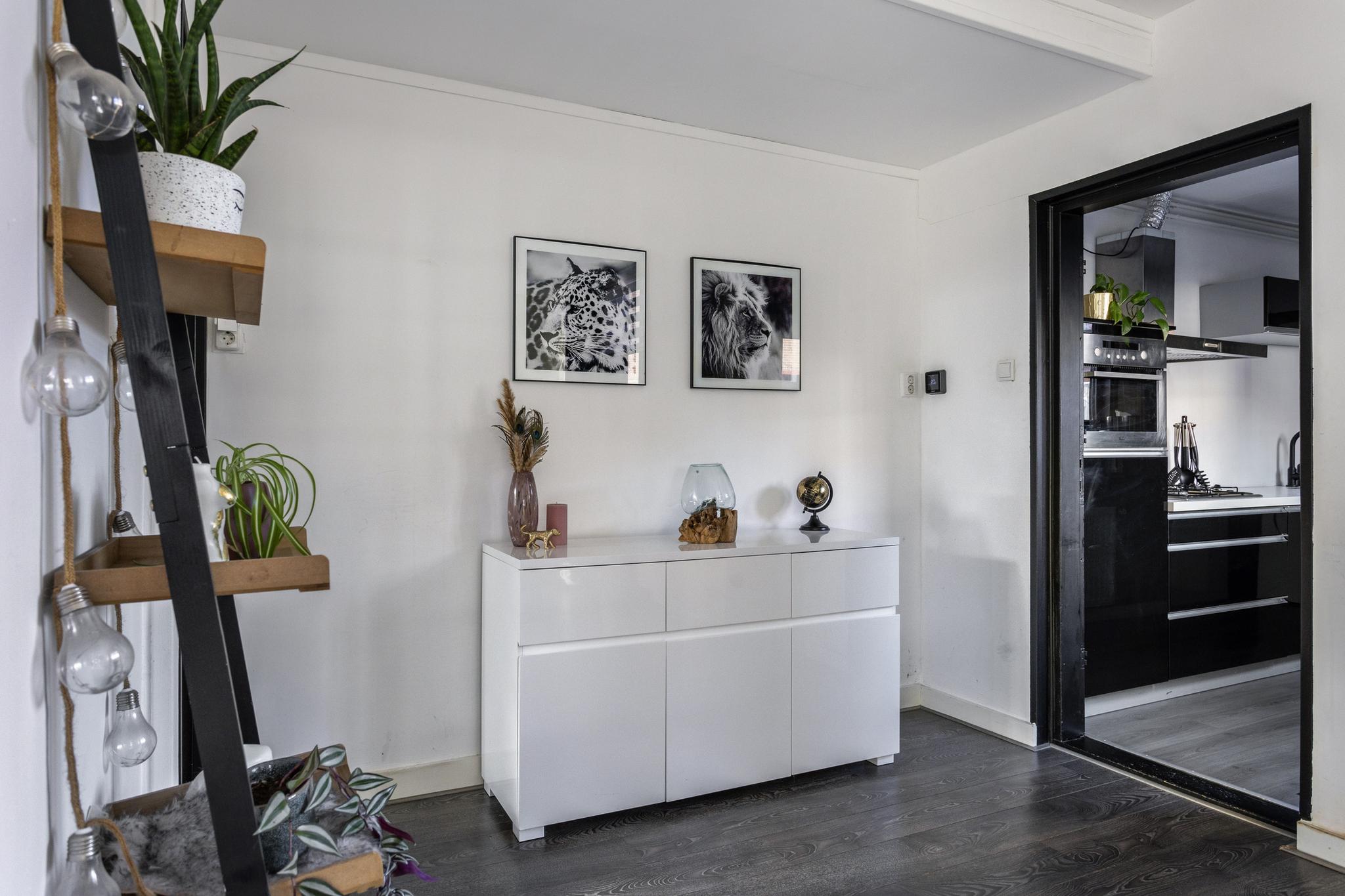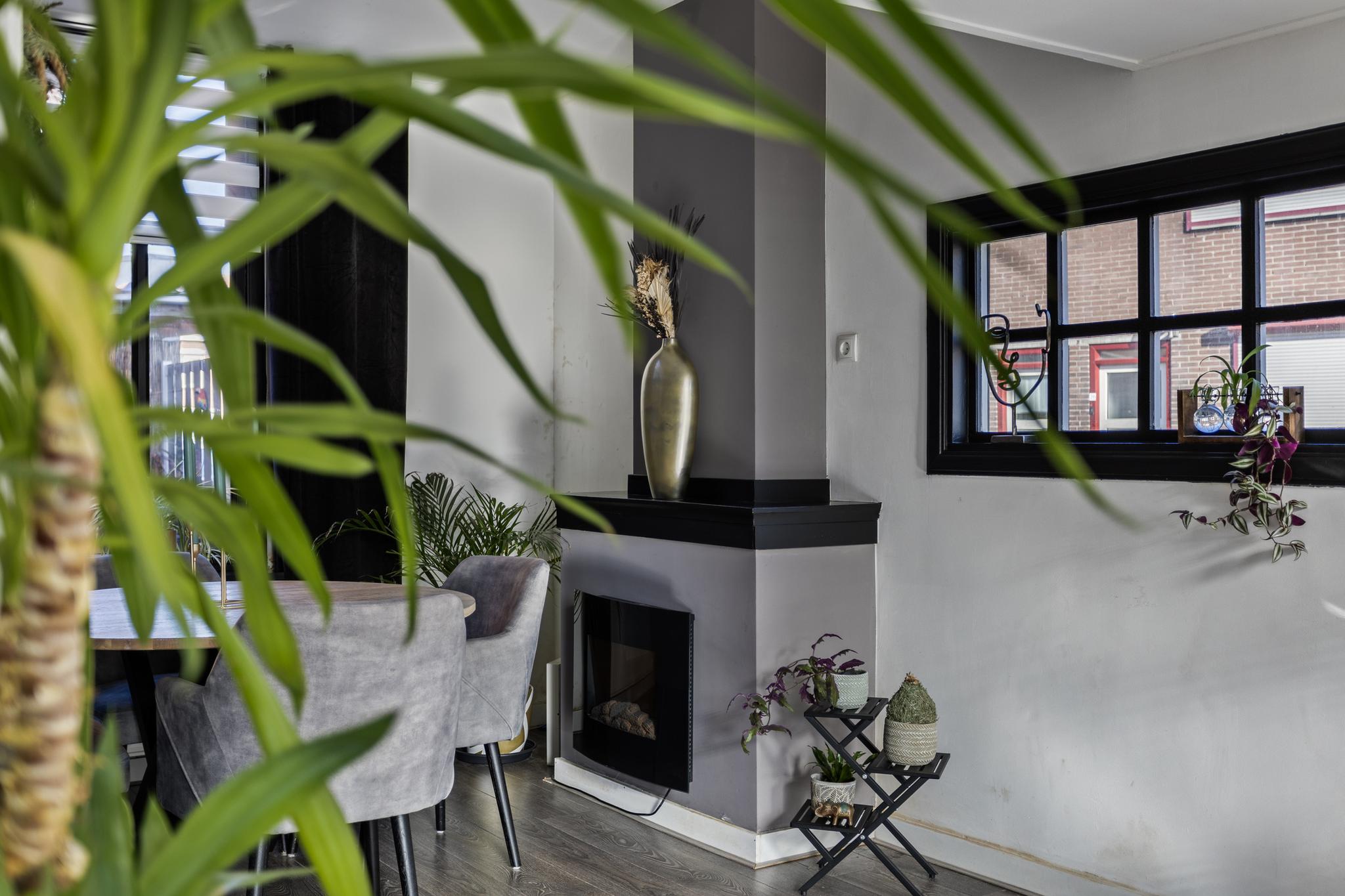 Entree via de hal met meterkast en dichte trapopgang naar 1e verdieping. Vervolgens kom je in de woonkamer die is ingedeeld met een zitgedeelte aan de voorzijde en een eetgedeelte aan de achterzijde. Het eetgedeelte heeft een schouw met sfeervolle elektrische haard en is uitgerust met inbouwspots. De vloer in hal en woonkamer is voorzien van laminaat.