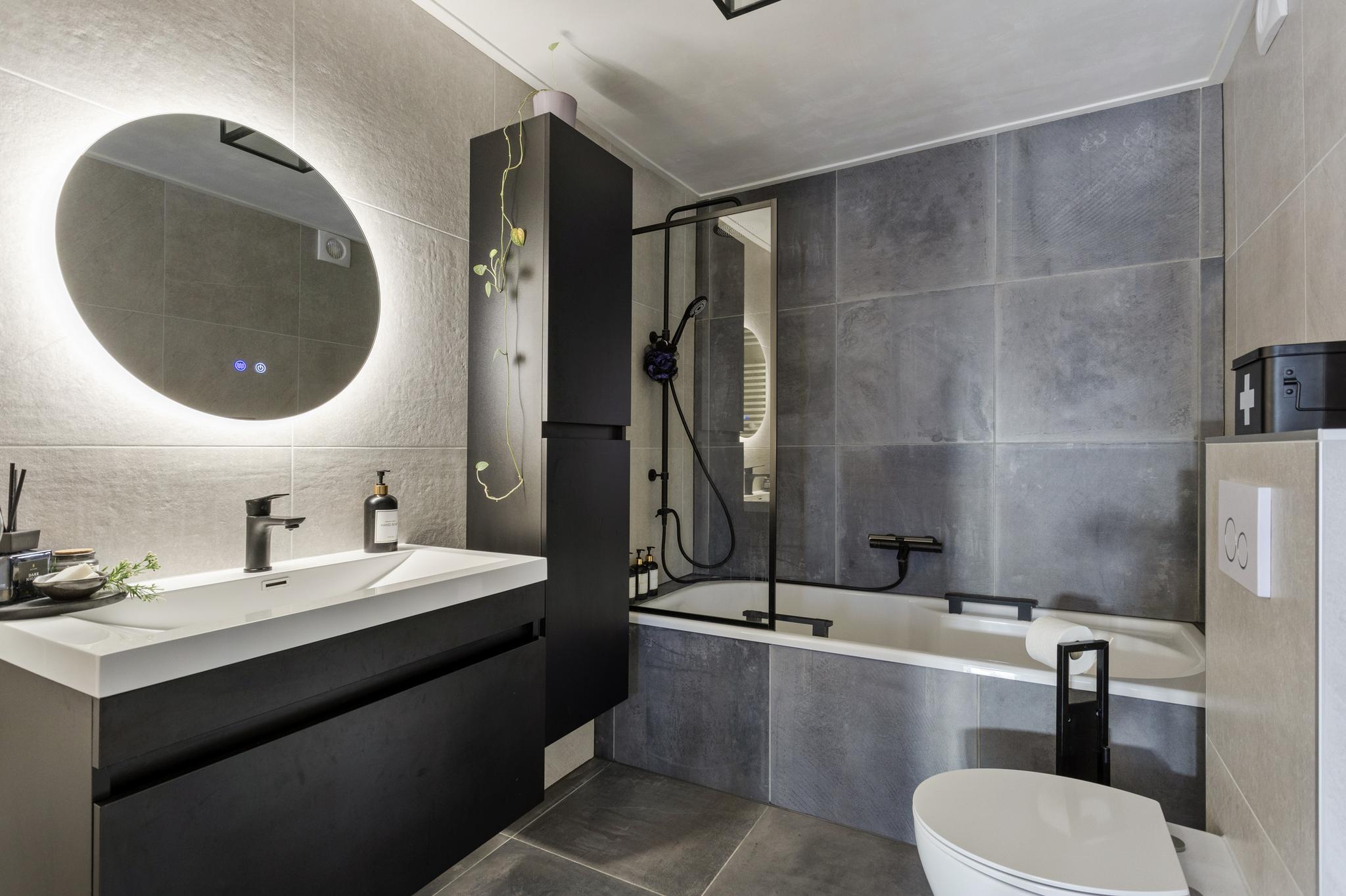 Tevens bevindt zich in de keuken de cv combi-ketel. Aansluitend aan de keuken is de badkamer die in 2023 geheel vernieuwd is. De badkamer is volledig betegeld en uitgerust met een ligbad, wastafel met wastafelmeubel, toilet, hoge kast en design radiator.
