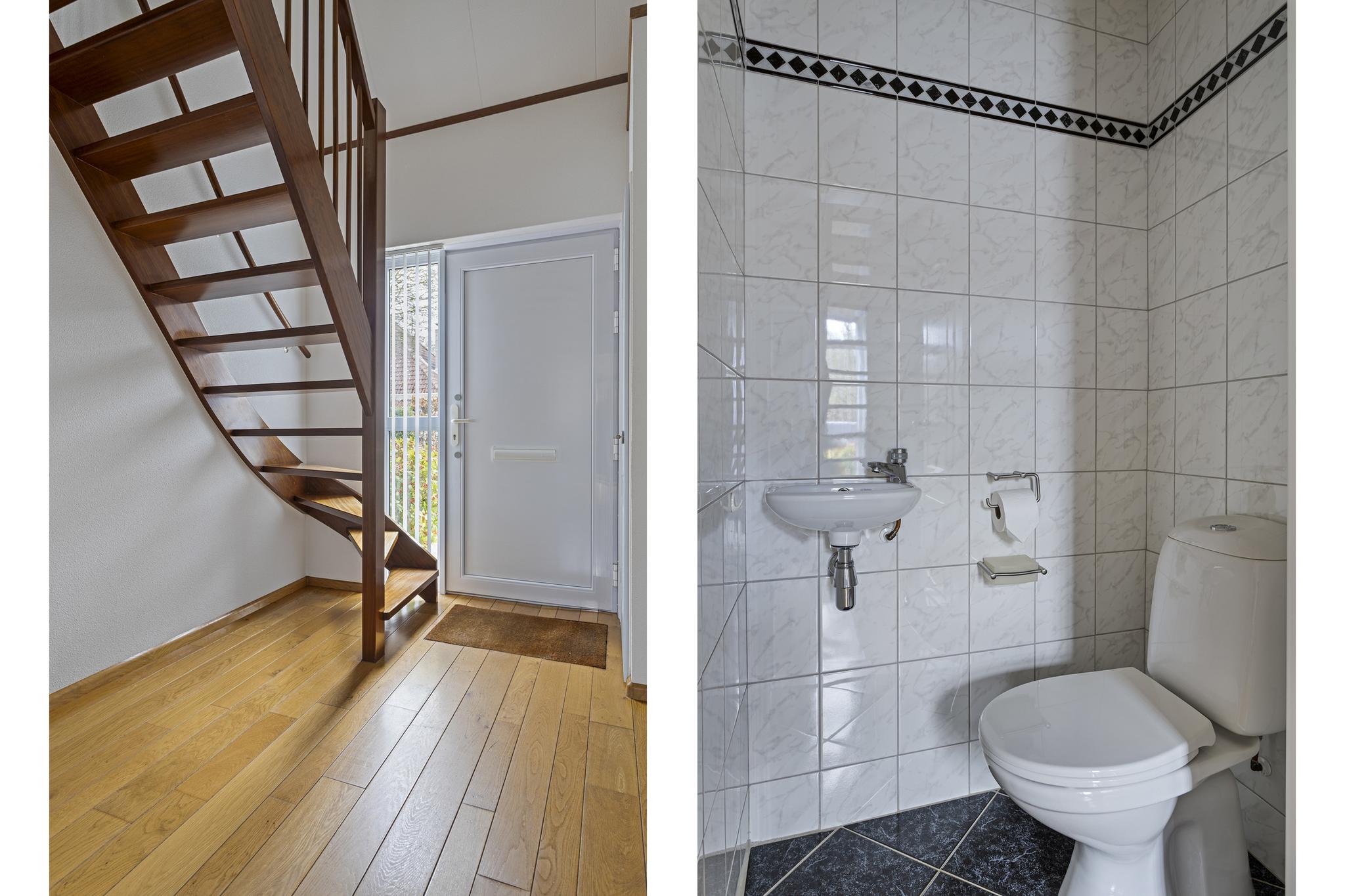 Entree via de hal die voorzien is van een massieve parketvloer, meterkast (10 groepen, aardlek en 3 fasen), toiletruimte en open trap naar de eerste verdieping. Vanuit de hal heeft u toegang tot de woonkamer, toiletruimte en het kantoor/hobbykamer.