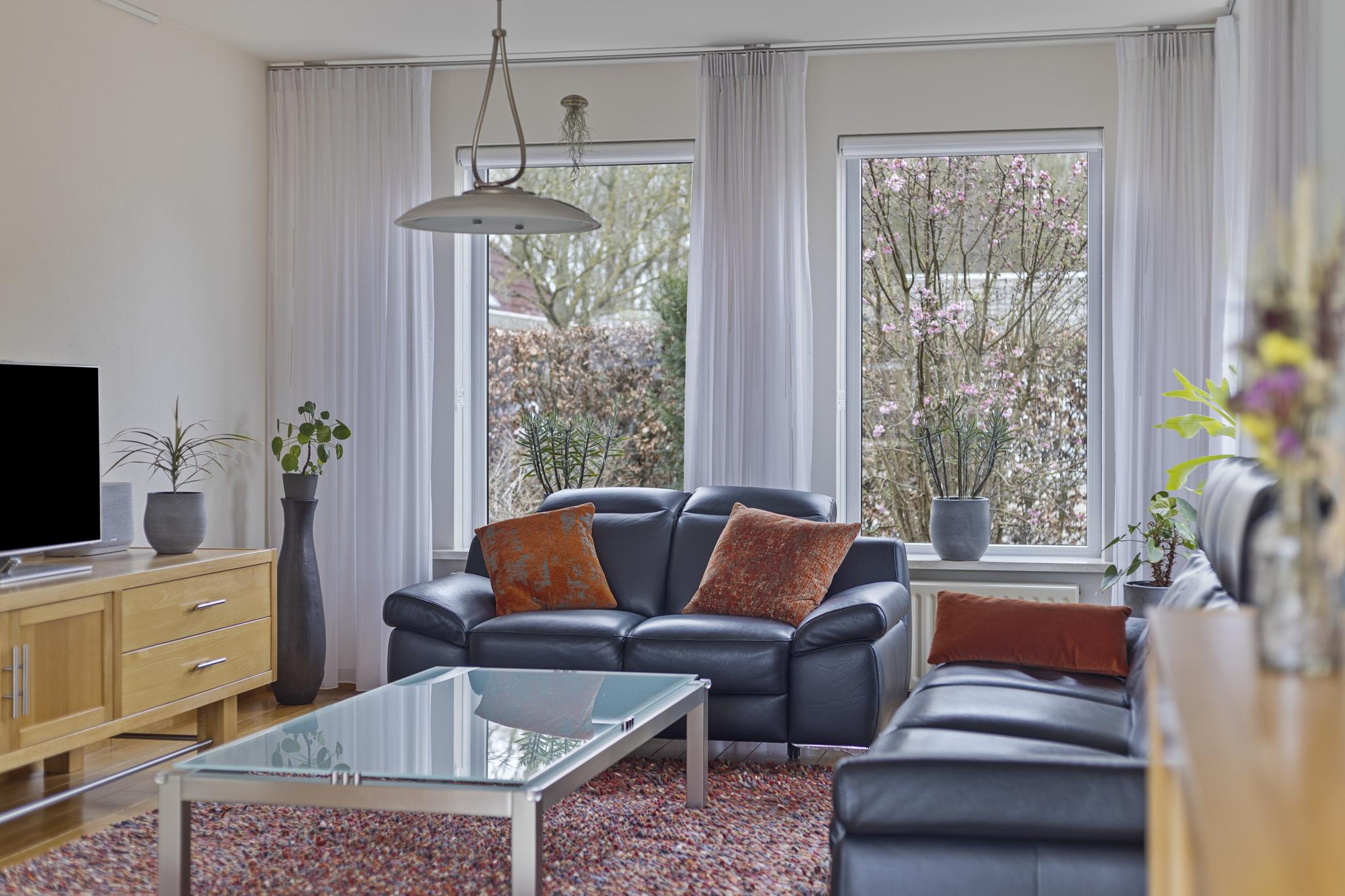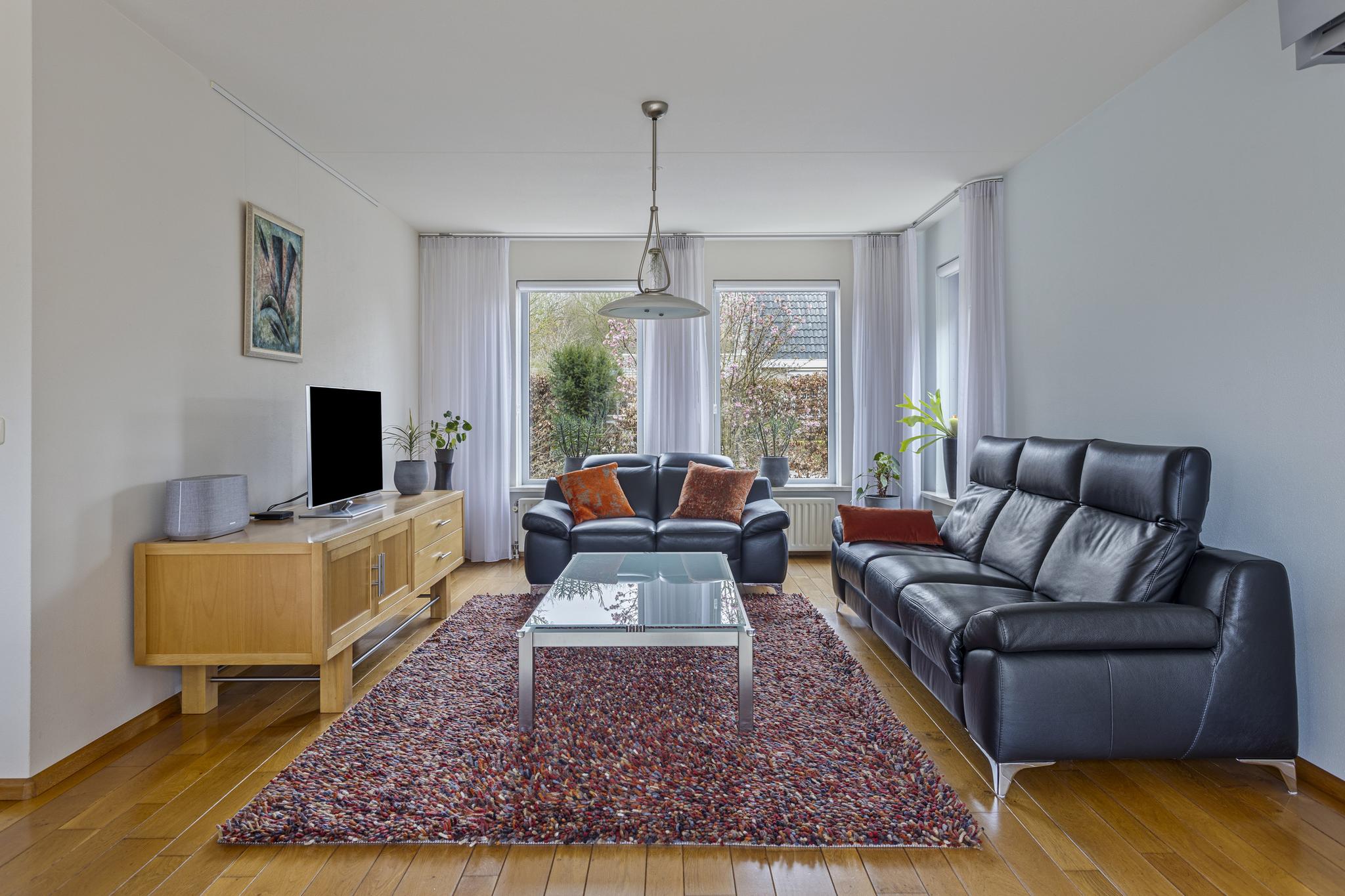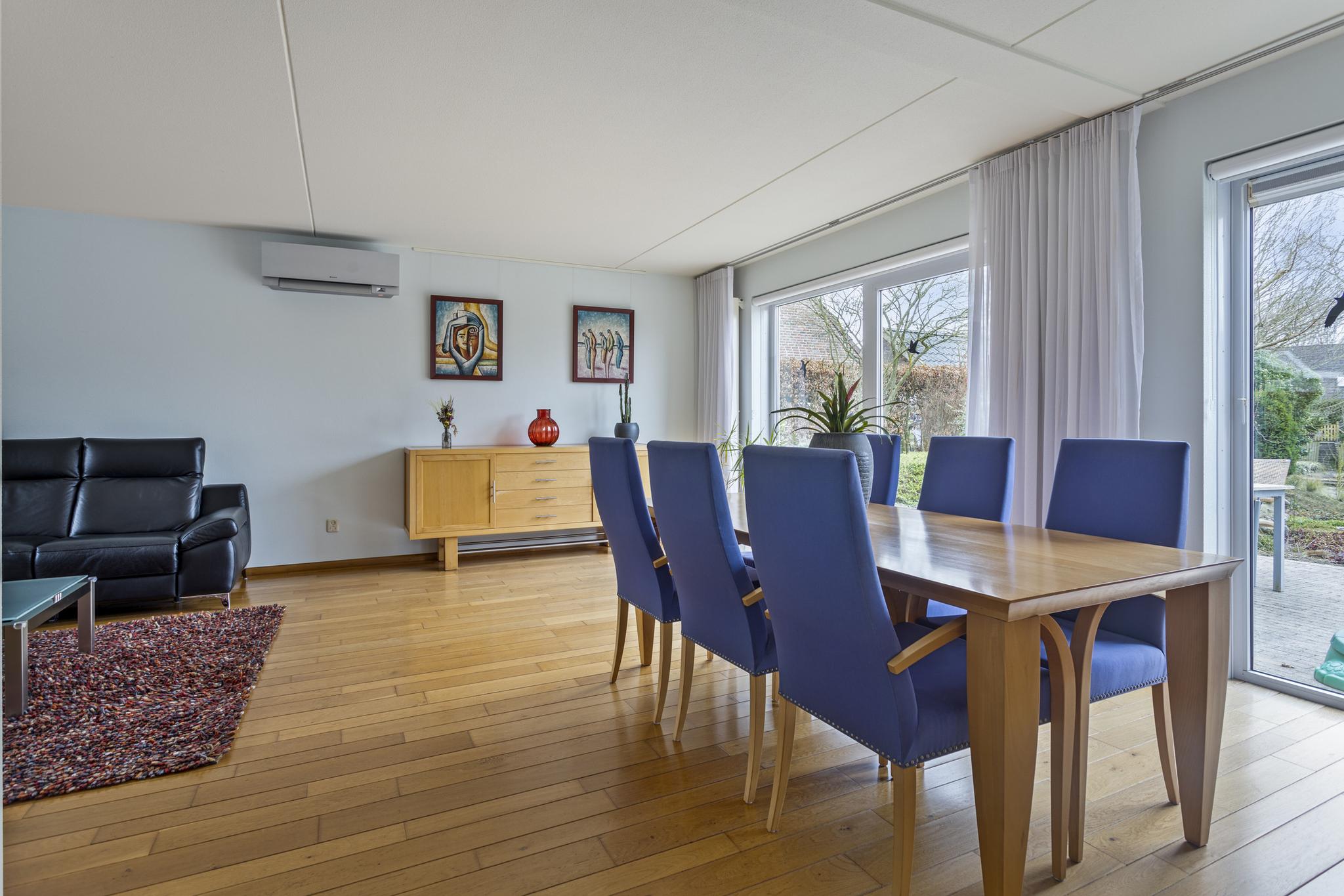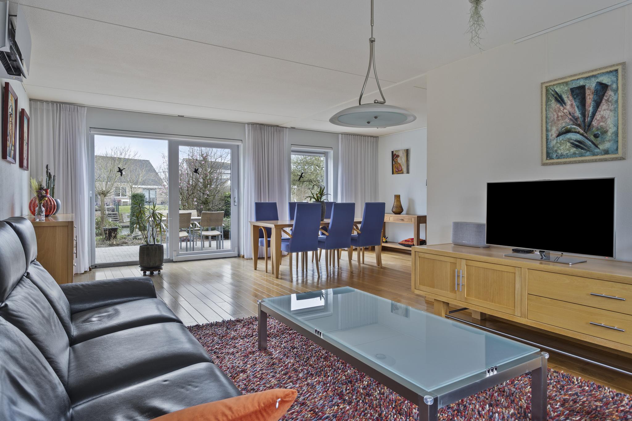 De L-vormige woonkamer is voorzien van een massieve parketvloer en heeft een zitgedeelte aan de voorzijde, waar een airco unit is geplaatst die kan koelen in de zomer en verwarmen in de winter. Het eetgedeelte is gesitueerd aan de achterzijde van de woning. Door middel van een schuifpui ontstaat er direct contact met de achtertuin en het aangrenzende water.