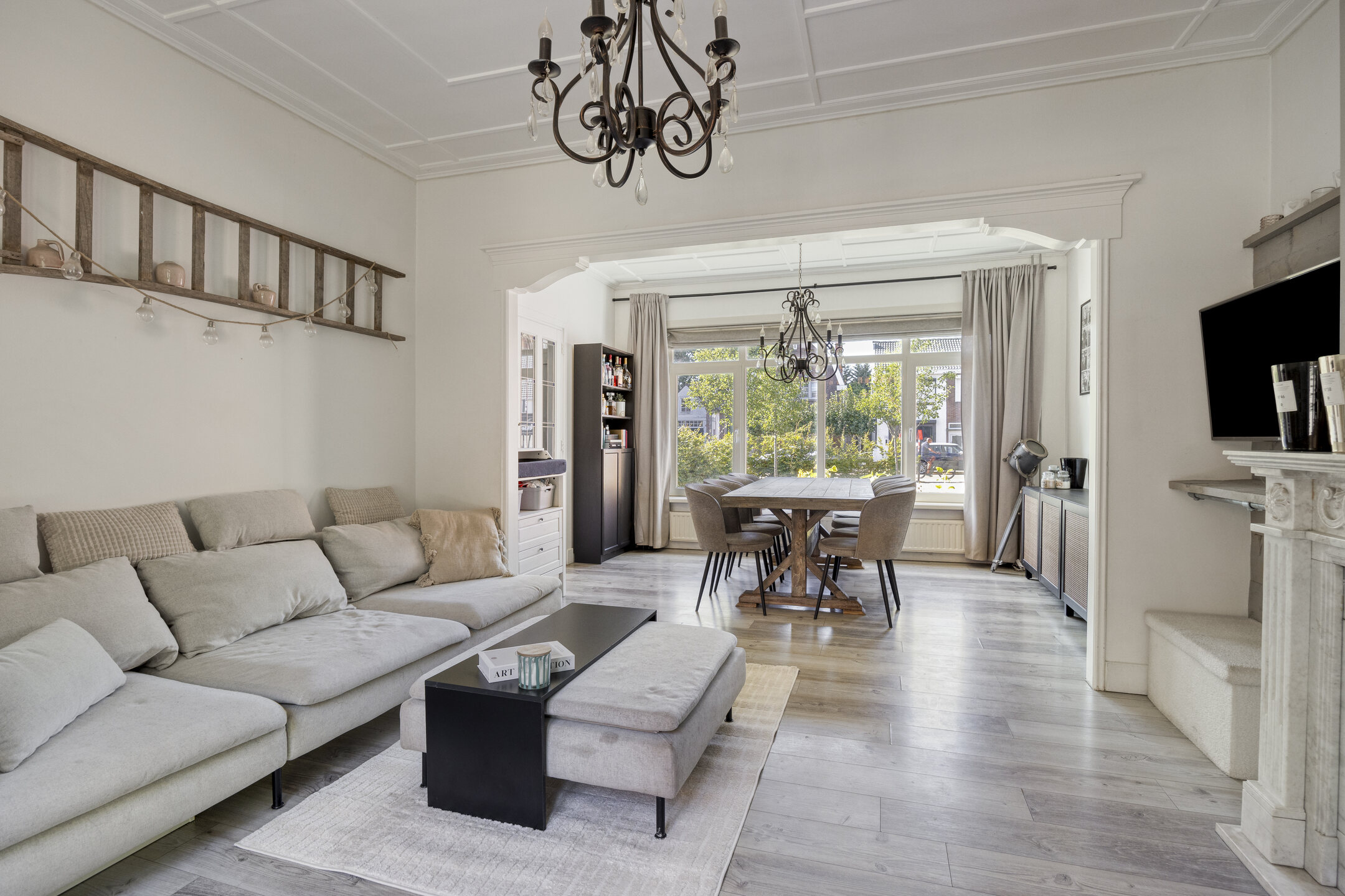 De woonkamer is ingedeeld met een eetgedeelte en zitgedeelte en voorzien van een laminaat vloer. Dubbele openslaande deuren bieden toegang naar het terras. De sfeervolle houthaard, paneeldeuren met glas-in-lood en authentieke plafond geven de woonkamer extra karakter.