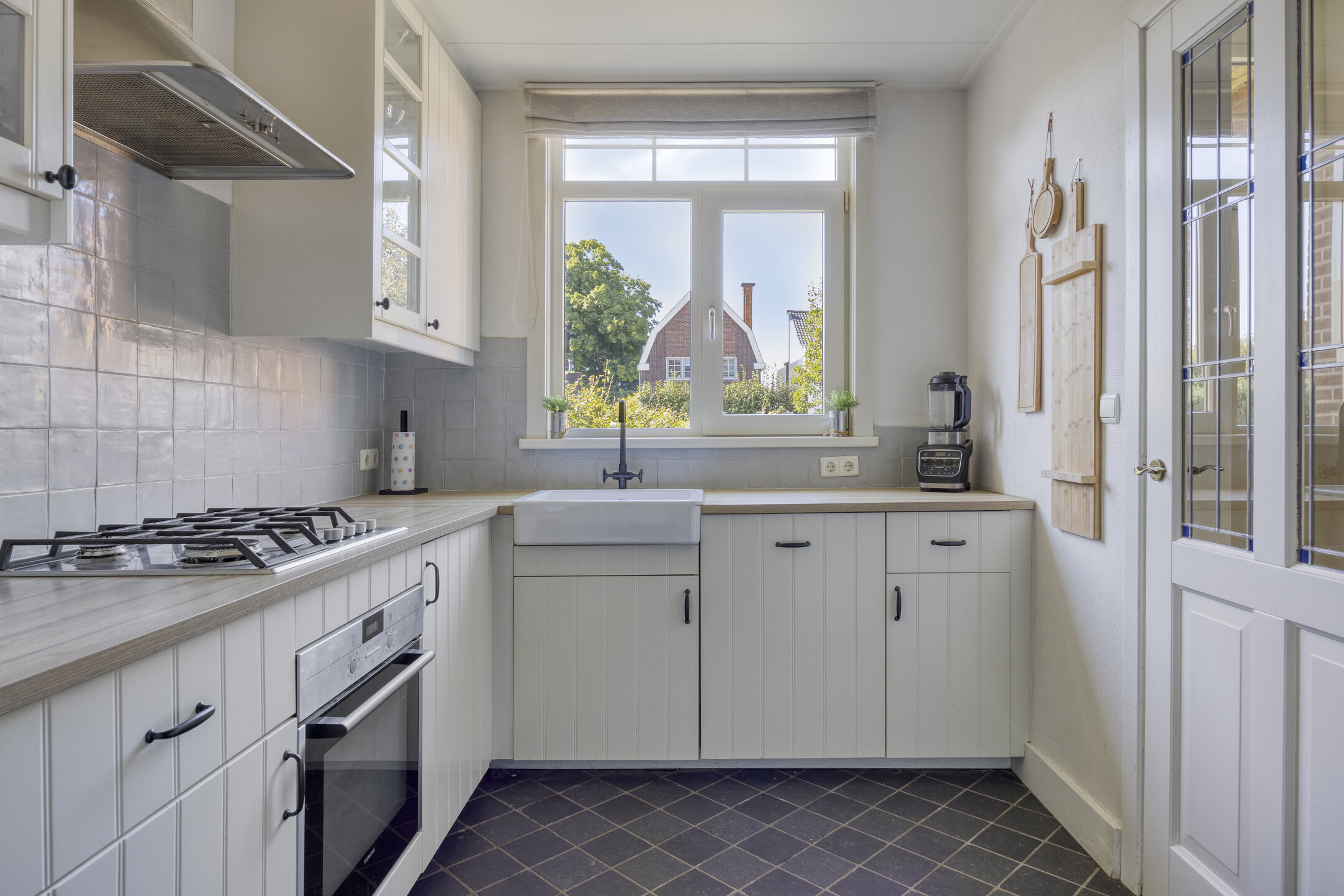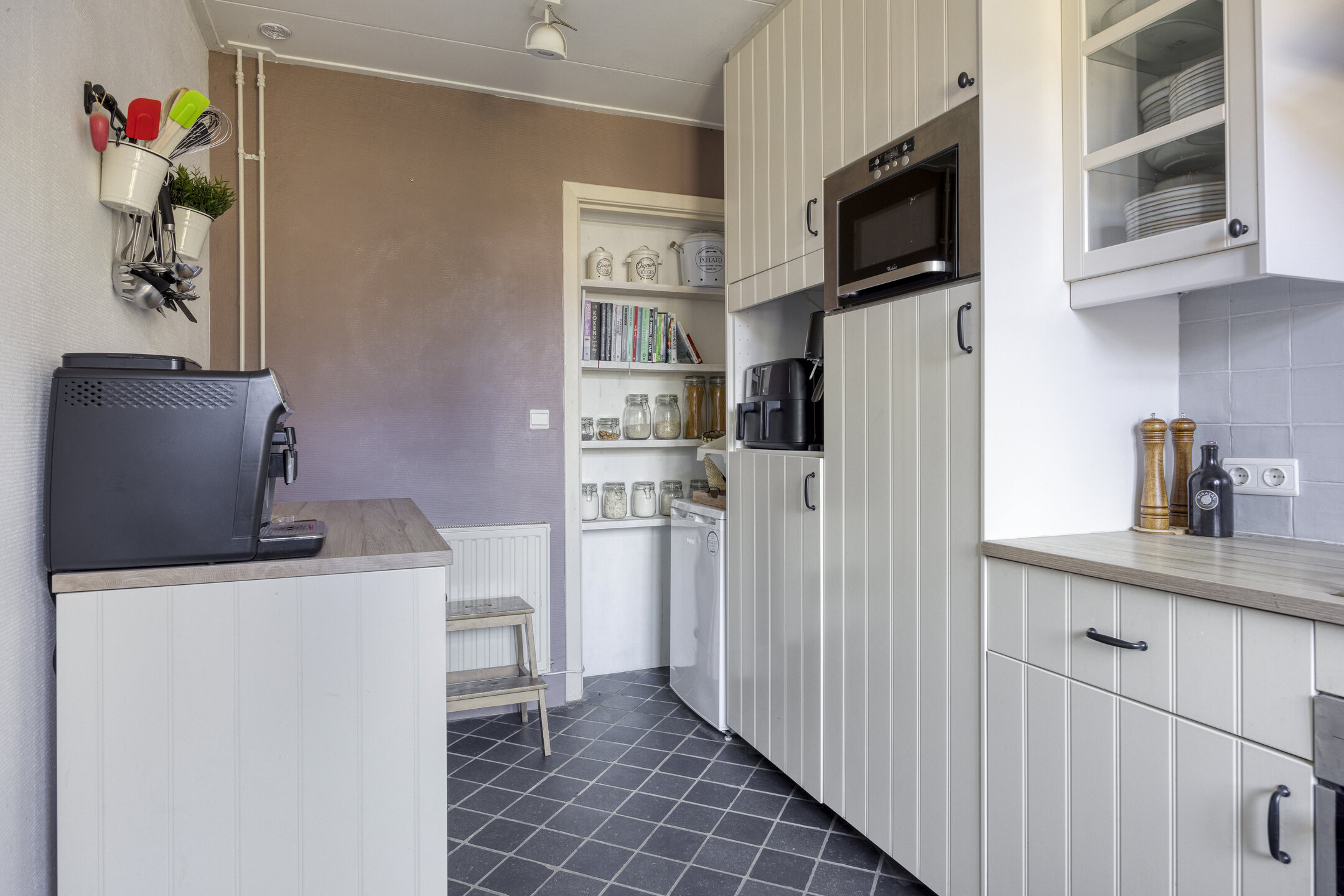 Entree via de hal met meterkast en trapopgang naar eerste verdieping. Via de hal is zowel de woonkamer als de keuken te bereiken. De ruime keuken is uitgevoerd in landelijke stijl en opgesteld in een hoekopstelling én heeft een ingebouwde kast. Qua inbouwapparatuur is de keuken van alle gemakken voorzien;