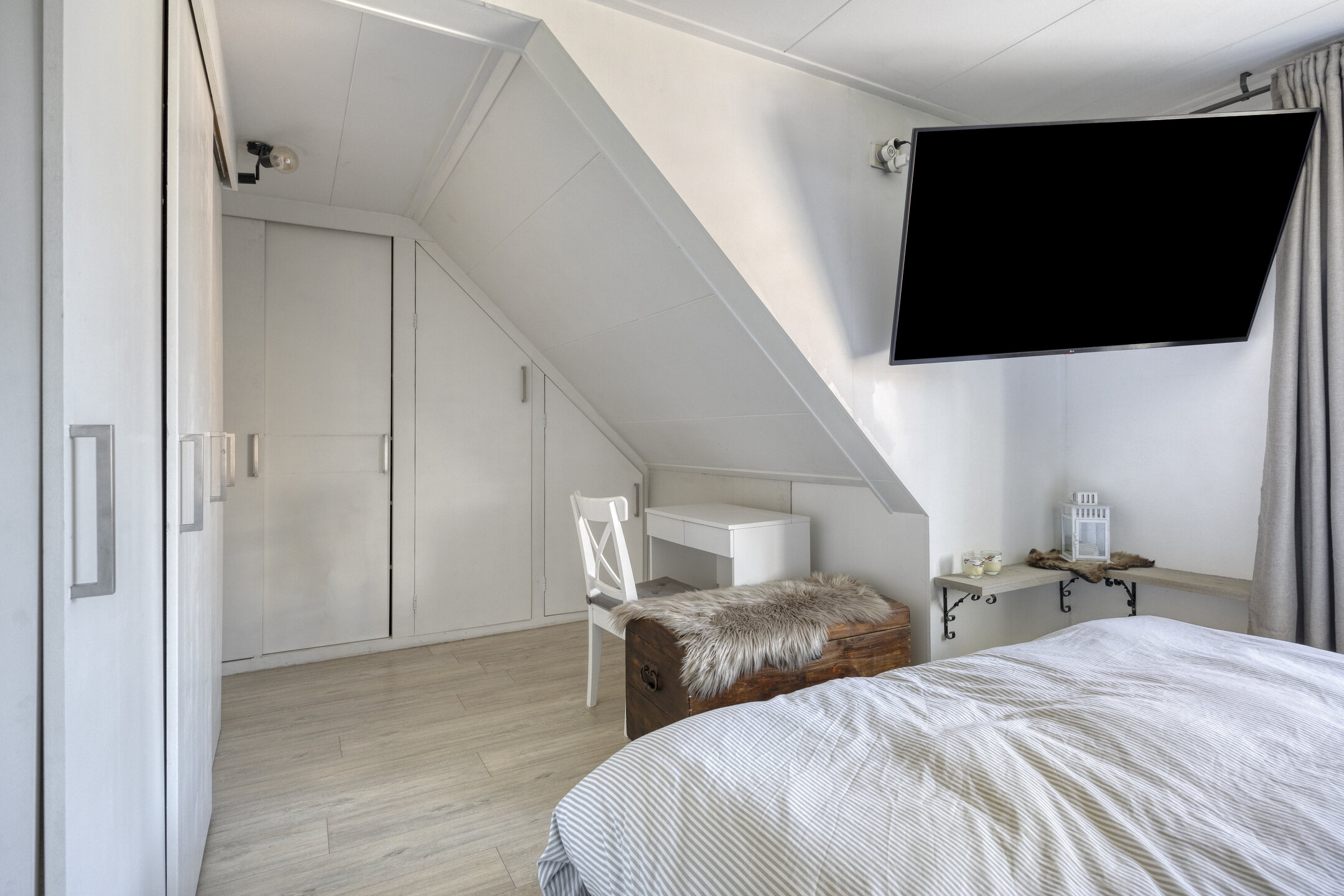 Via een vlizotrap is de vliering te bereiken die als bergzolder gebruikt kan worden voor de niet-alledaagse spullen.