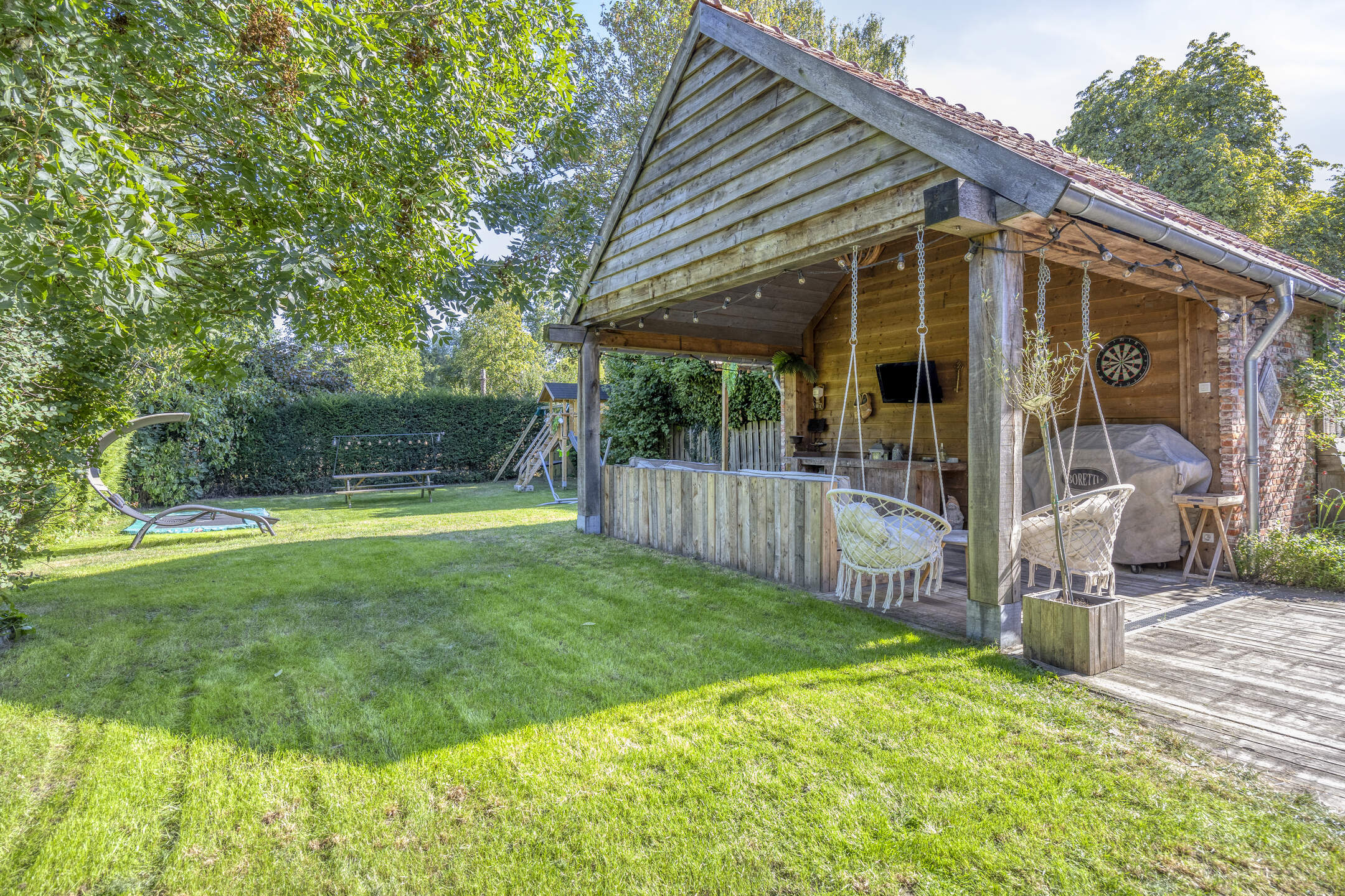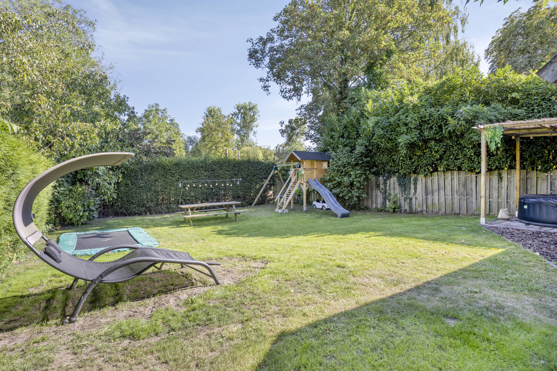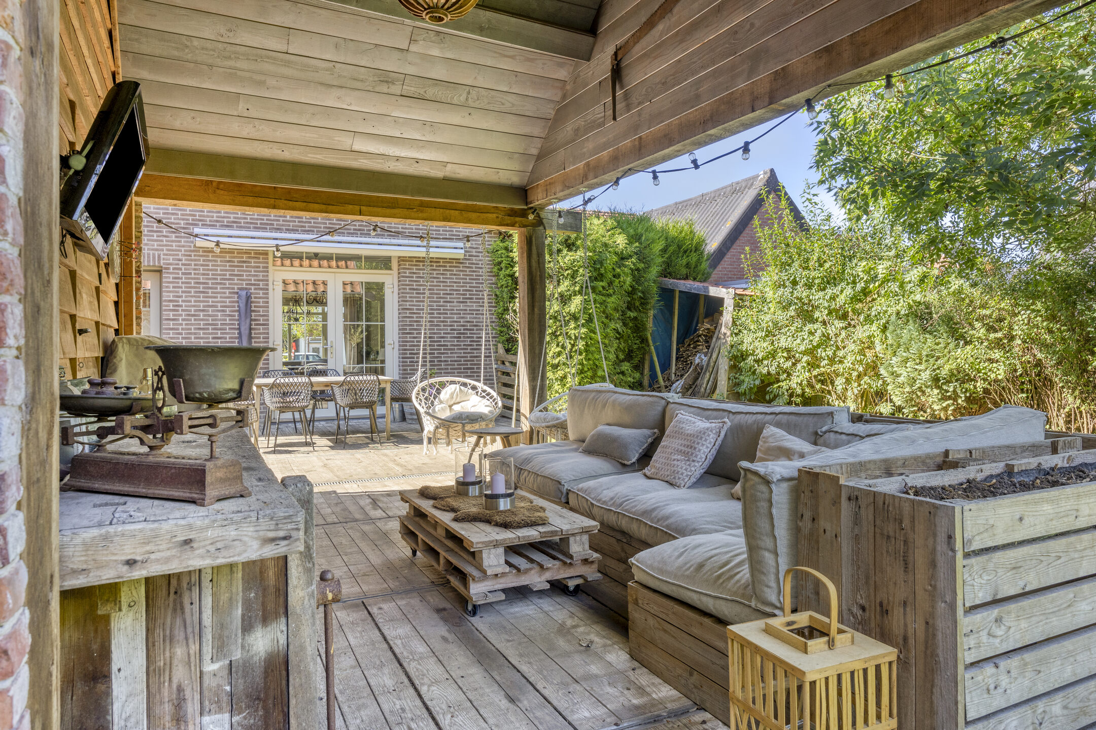 Zowel de voortuin als de achtertuin is royaal bemeten. De voortuin is ingedeeld met een gazon en een oprit met parkeerplaats waardoor er met gemak vier auto’s geparkeerd kunnen worden. De achtertuin heeft een ruim houten vlonder terras aan de achtergevel met elektrische zonwering. Tevens is er een grote vrijstaande berging met vliering én overkapping waar tot in de late uurtjes van het buitenleven kan worden genoten. Het riante gazon is een ideale speelplek voor de kinderen. De volwassen begroeiing rondom geeft de tuin een optimale privacy.