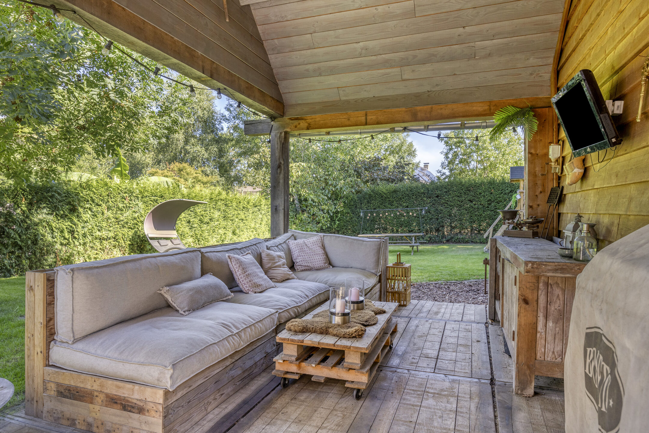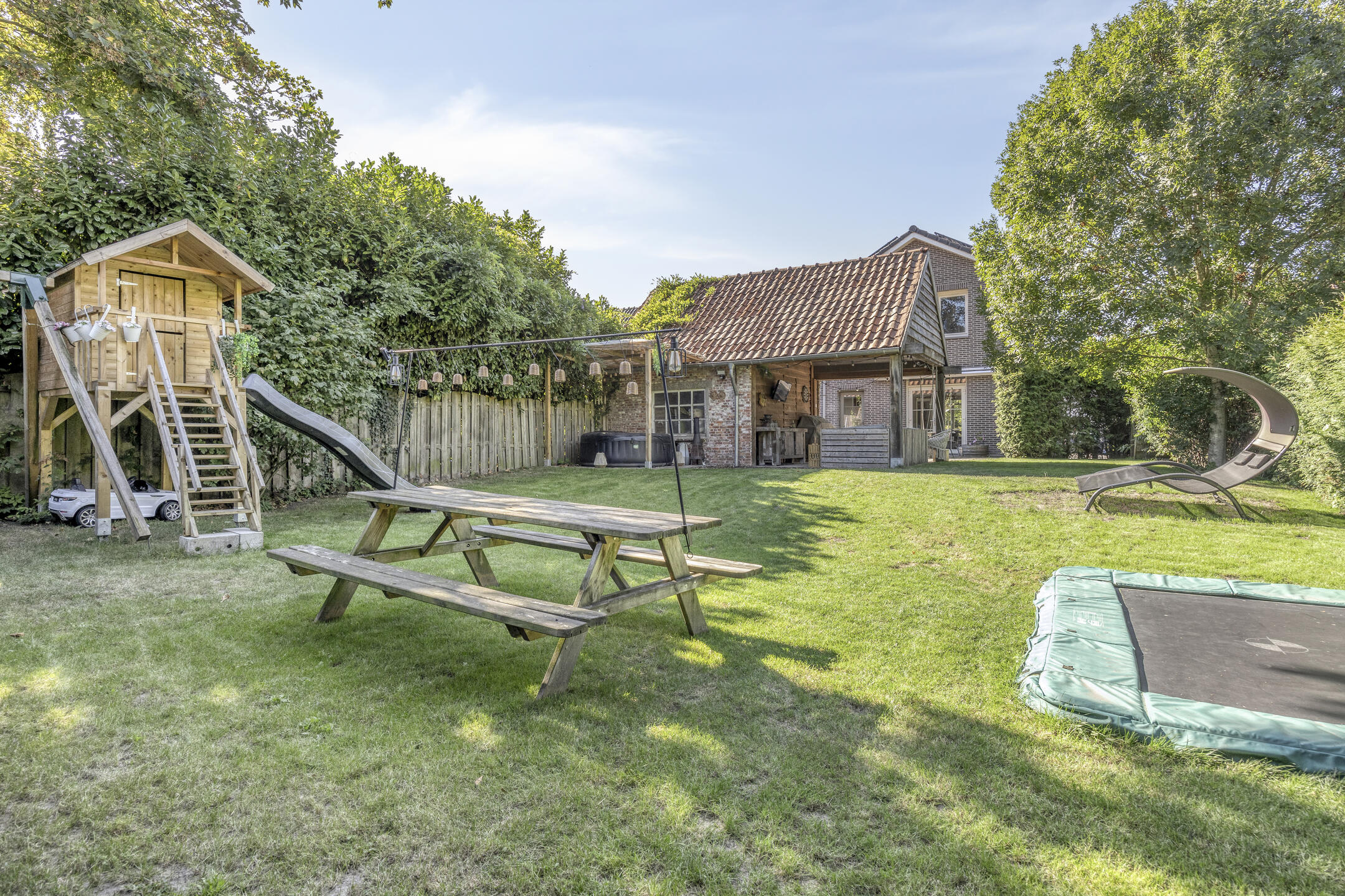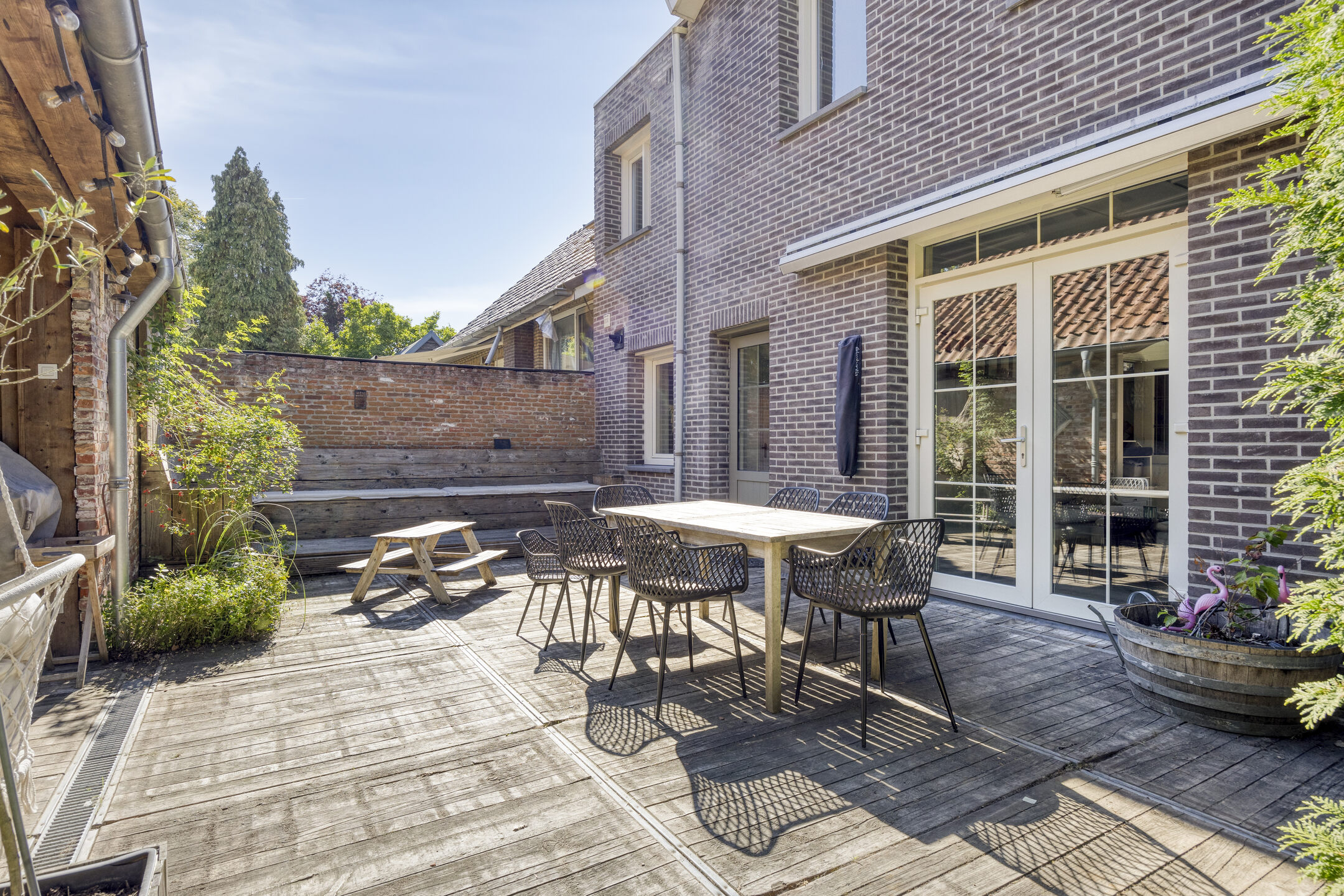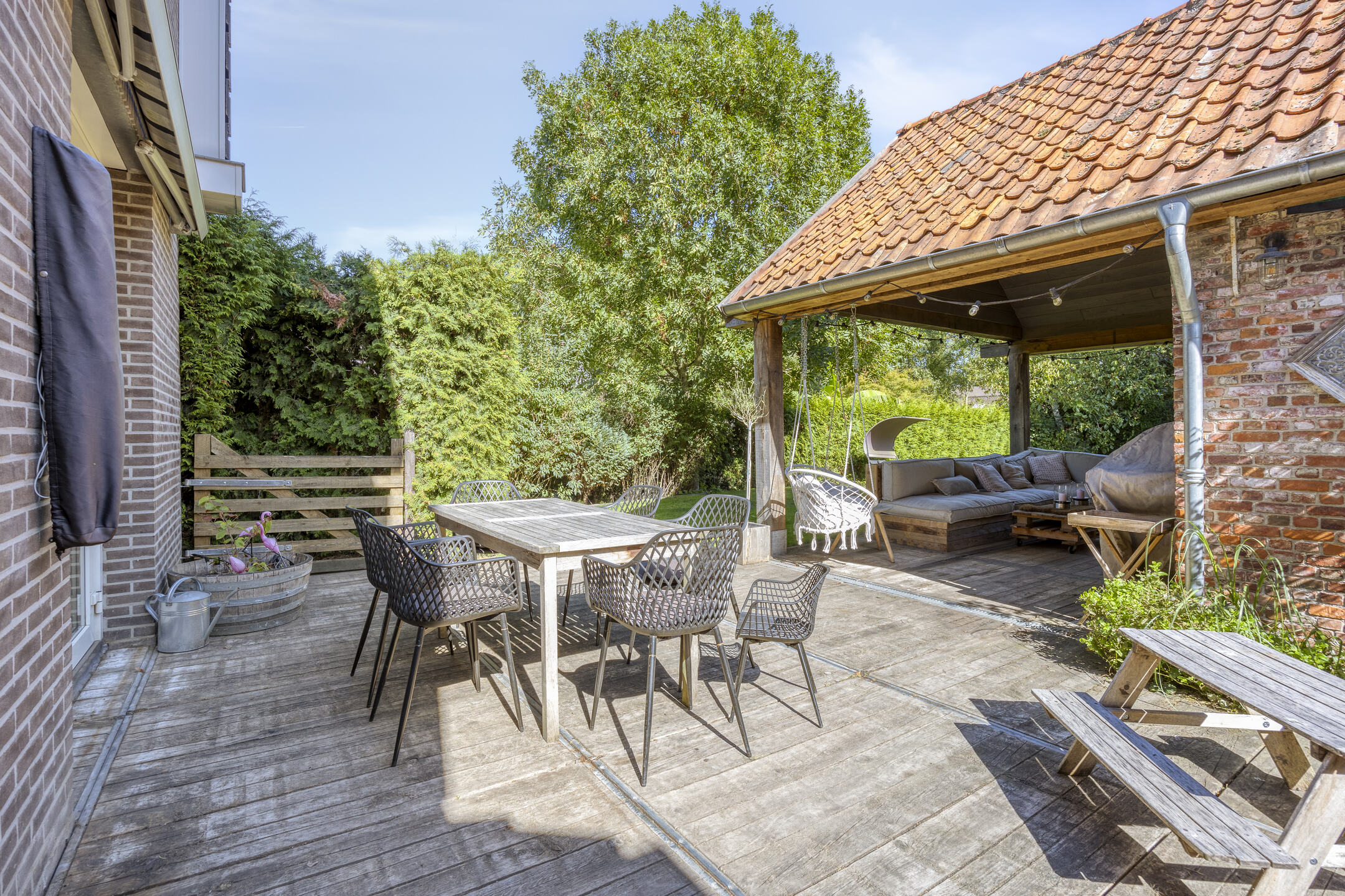 Zowel de voortuin als de achtertuin is royaal bemeten. De voortuin is ingedeeld met een gazon en een oprit met parkeerplaats waardoor er met gemak vier auto’s geparkeerd kunnen worden. De achtertuin heeft een ruim houten vlonder terras aan de achtergevel met elektrische zonwering. Tevens is er een grote vrijstaande berging met vliering én overkapping waar tot in de late uurtjes van het buitenleven kan worden genoten. Het riante gazon is een ideale speelplek voor de kinderen. De volwassen begroeiing rondom geeft de tuin een optimale privacy.