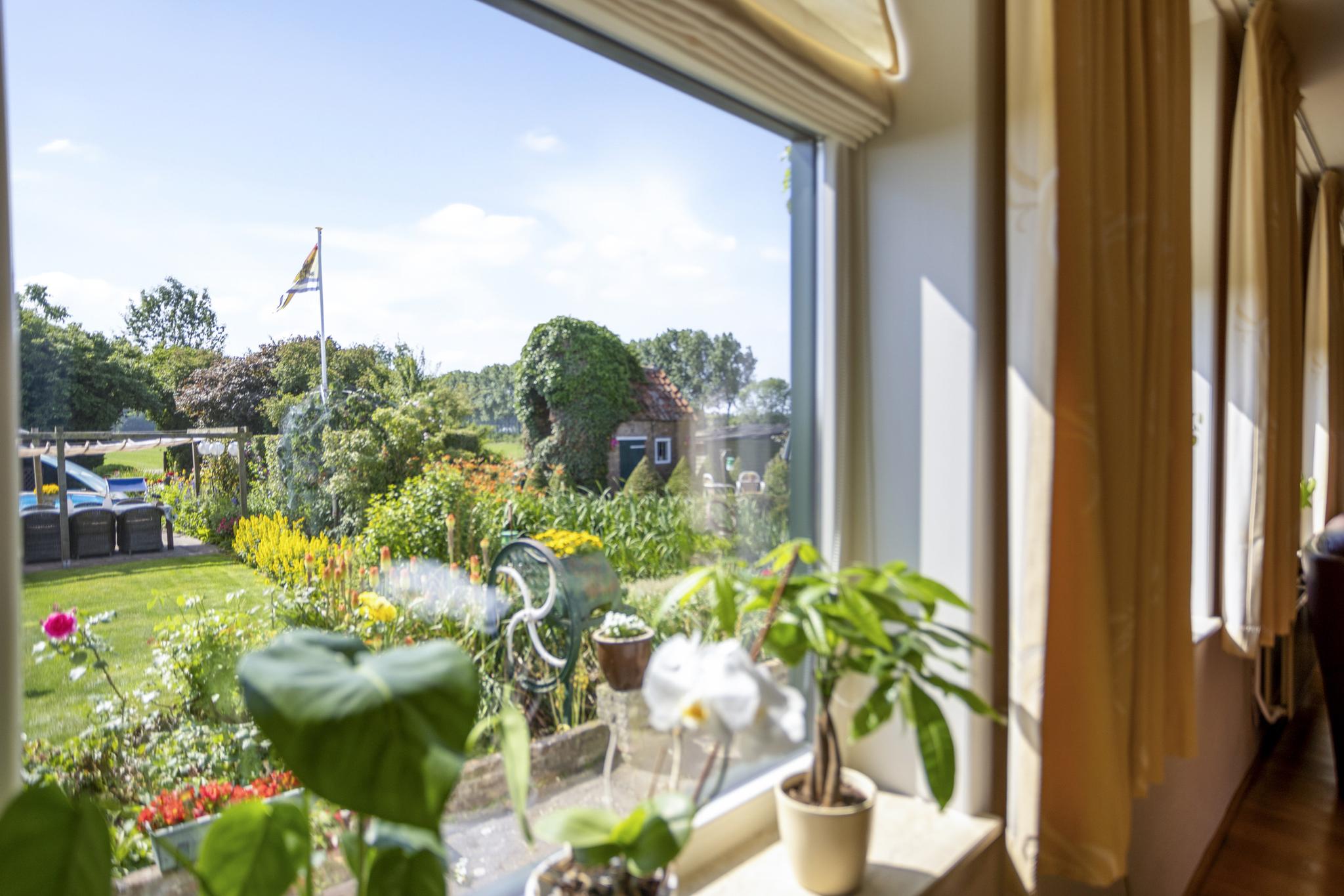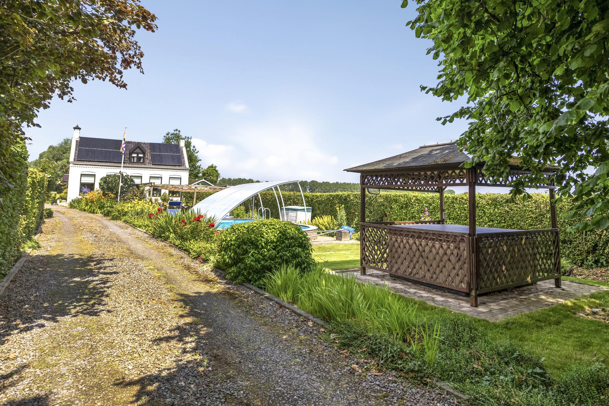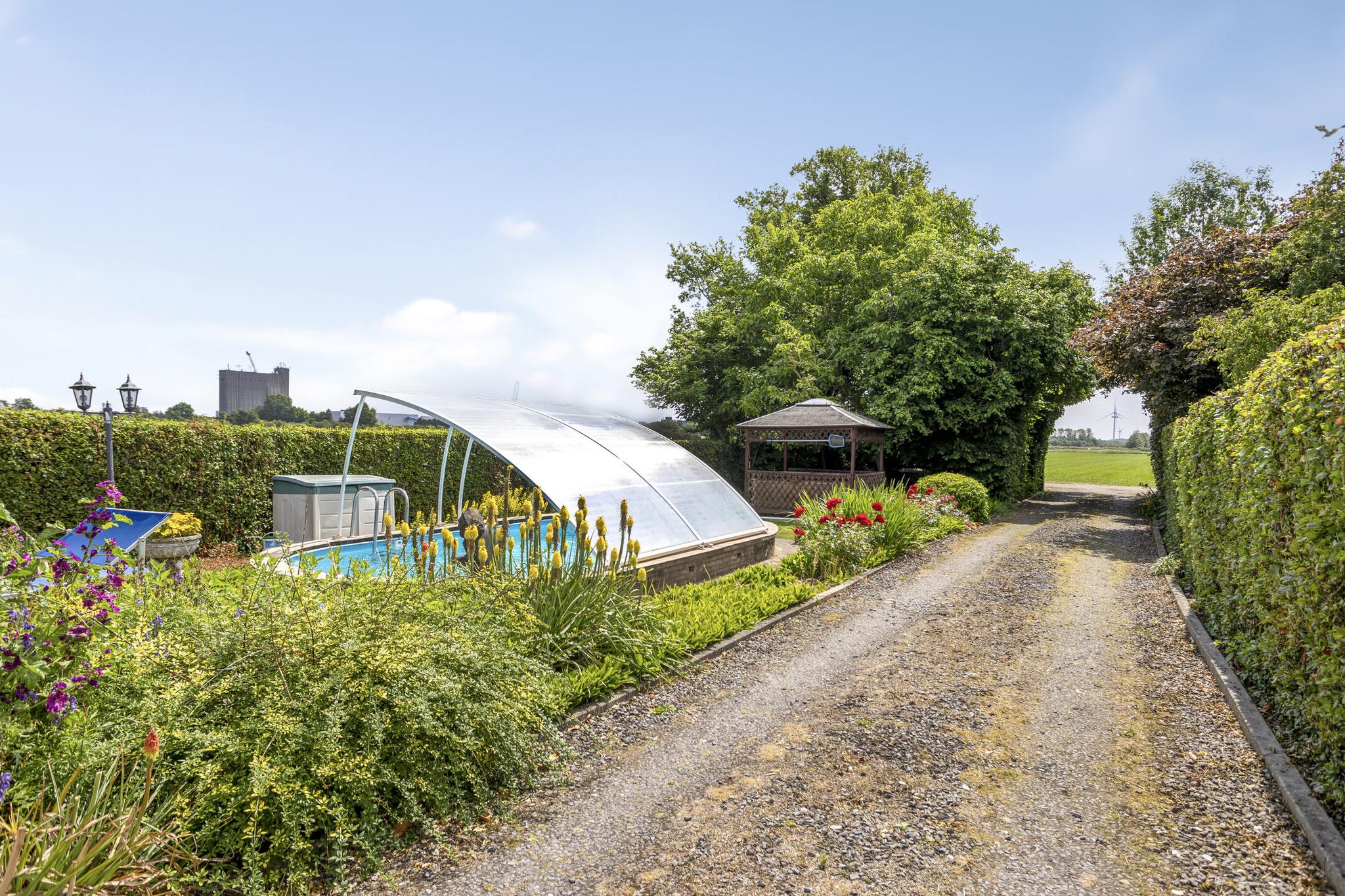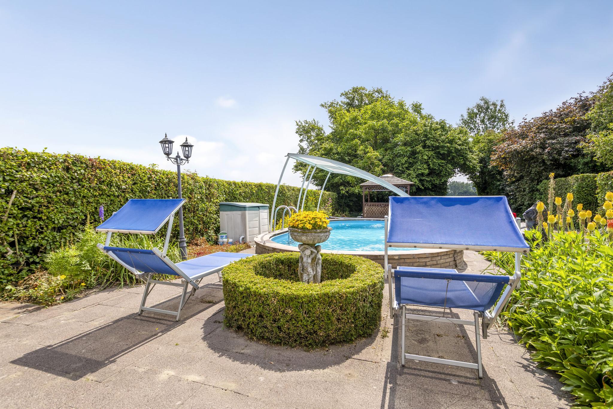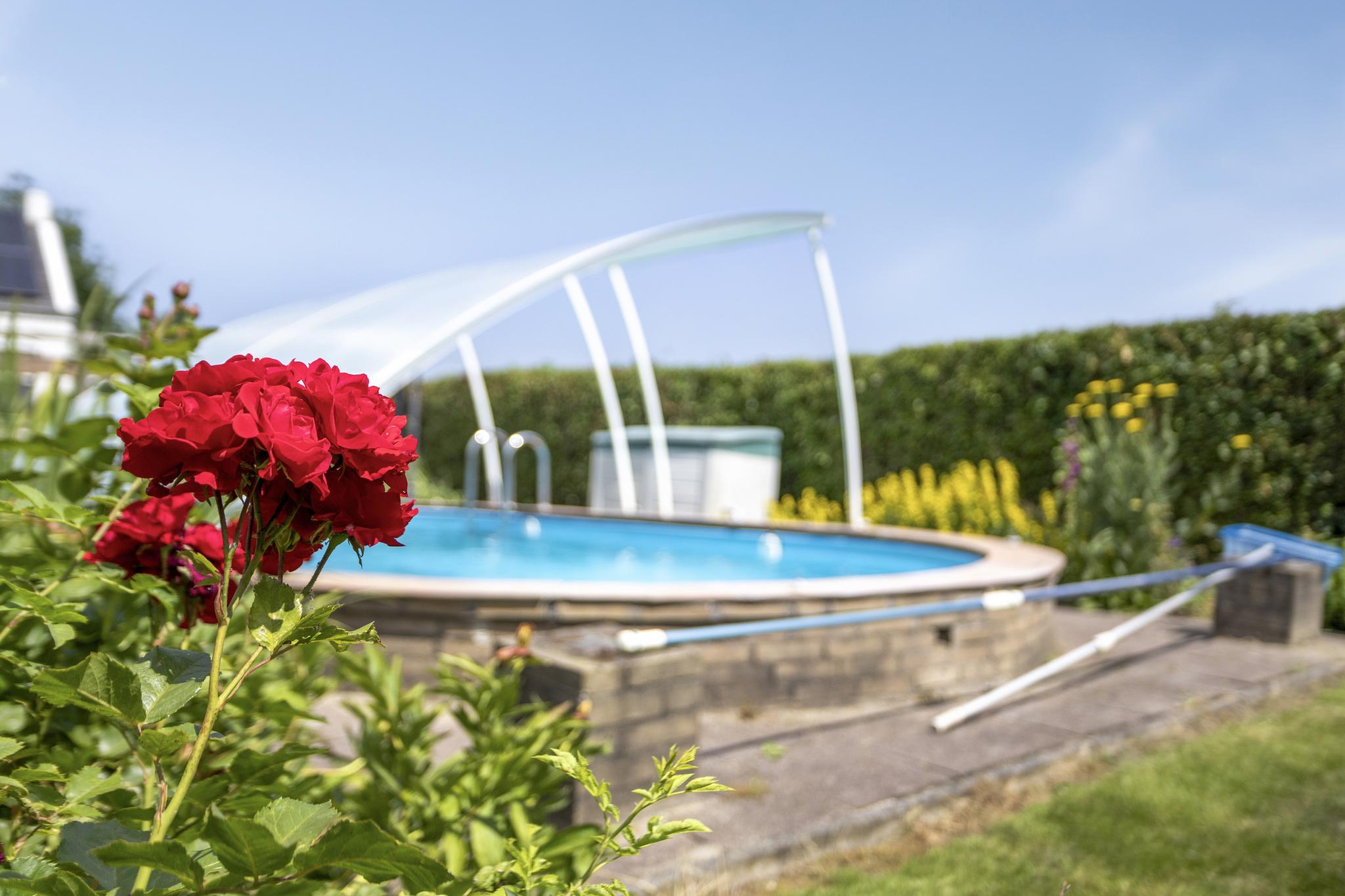 Het zwembad is gelegen in de voortuin, welke een maximale privacy biedt. Het zwembad heeft een afneembare overkapping. Aansluitend is een zonneterras met buitenkeuken.