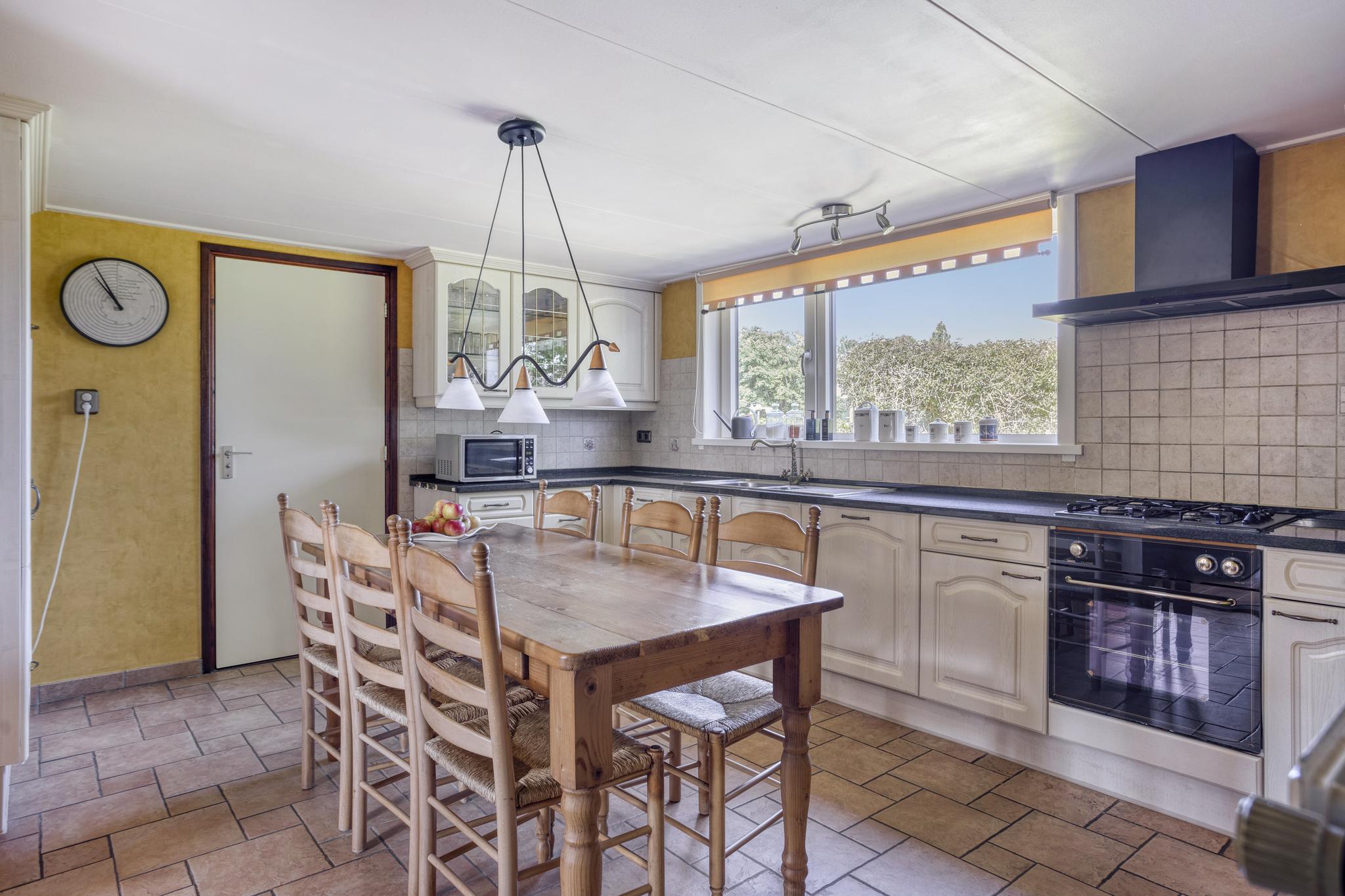 De ruime woonkeuken is voorzien van een tegelvloer, de keuken is in L-opstelling (1999) en voorzien van diverse inbouwapparatuur: