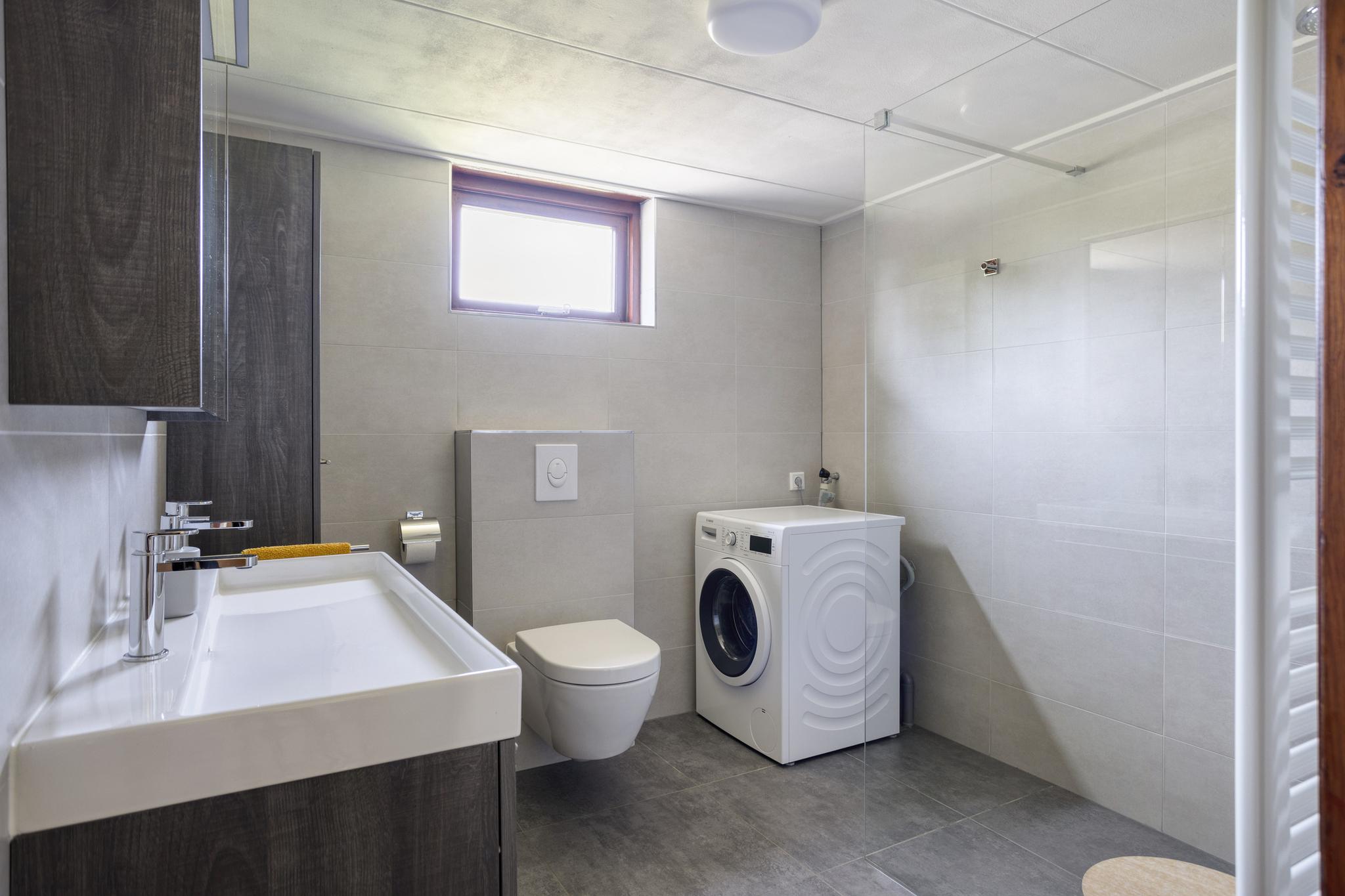 Luxe badkamer (2018), geheel betegeld en voorzien van inloopdouche, hangtoilet, dubbele wastafel met wastafelmeubel, kast, designradiator en aansluiting voor de wasmachine.