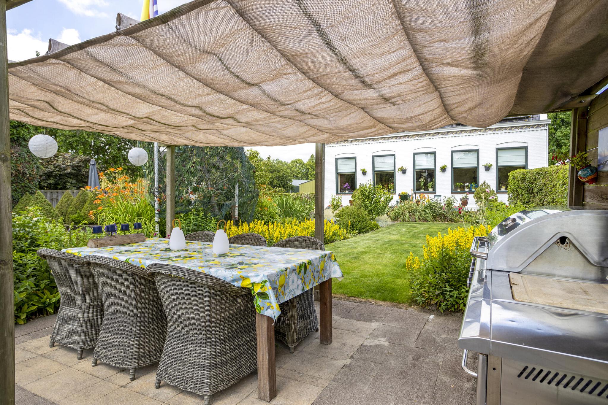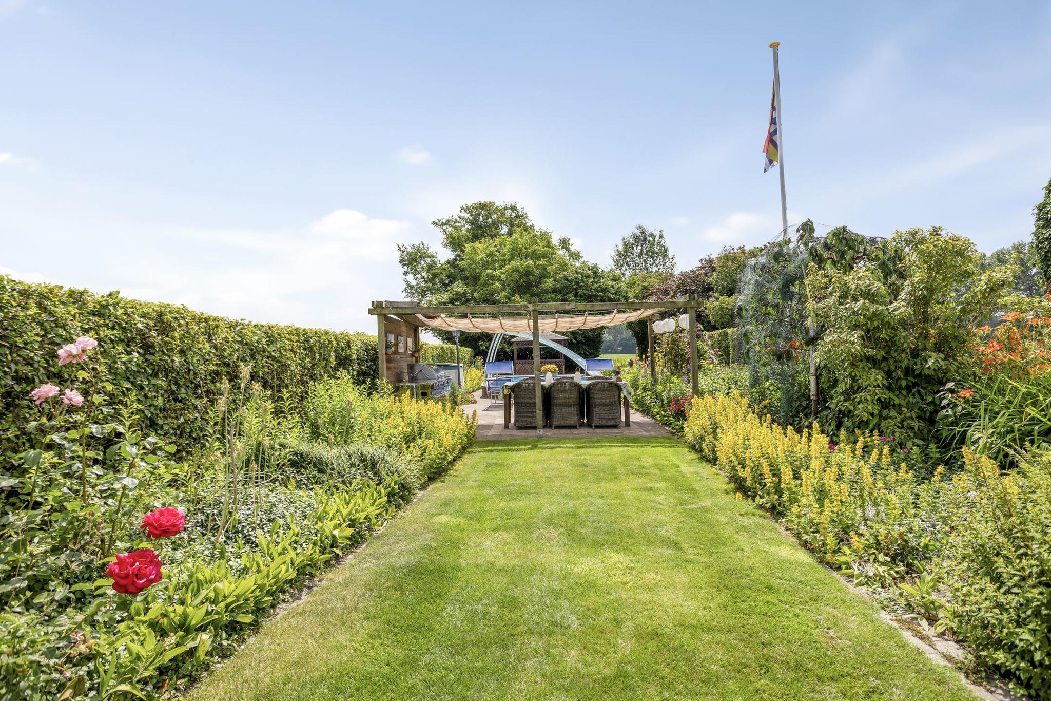 De tuin is rondom de woning gelegen en bereikbaar via een dubbel tuinhek met oprijlaan en is voorzien van gazon, diverse borders met sierbeplanting, een vijver, meerdere zitjes, een jacuzzi, een zwembad, een tuinhuis (met sauna), een moestuin met hobbykas.