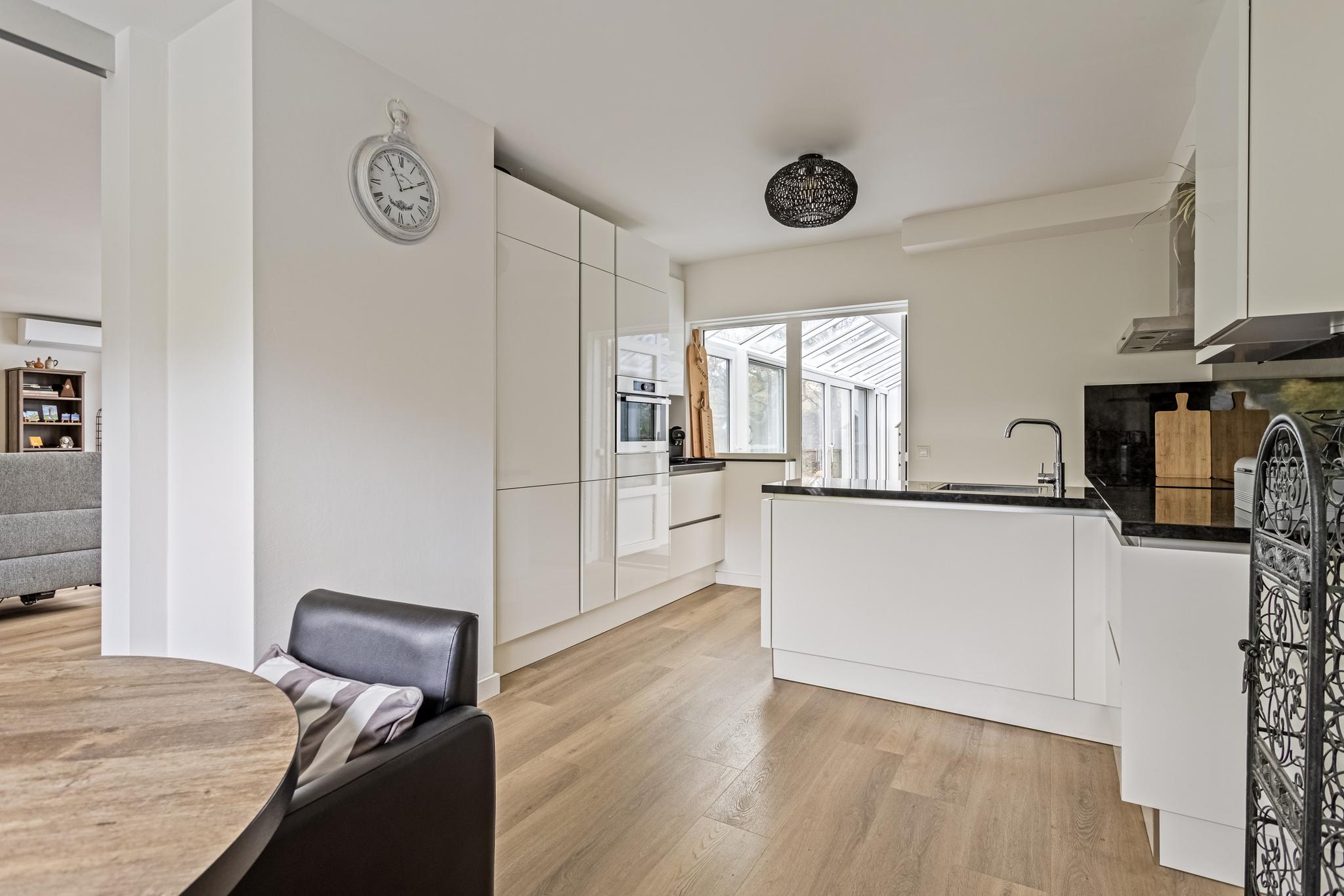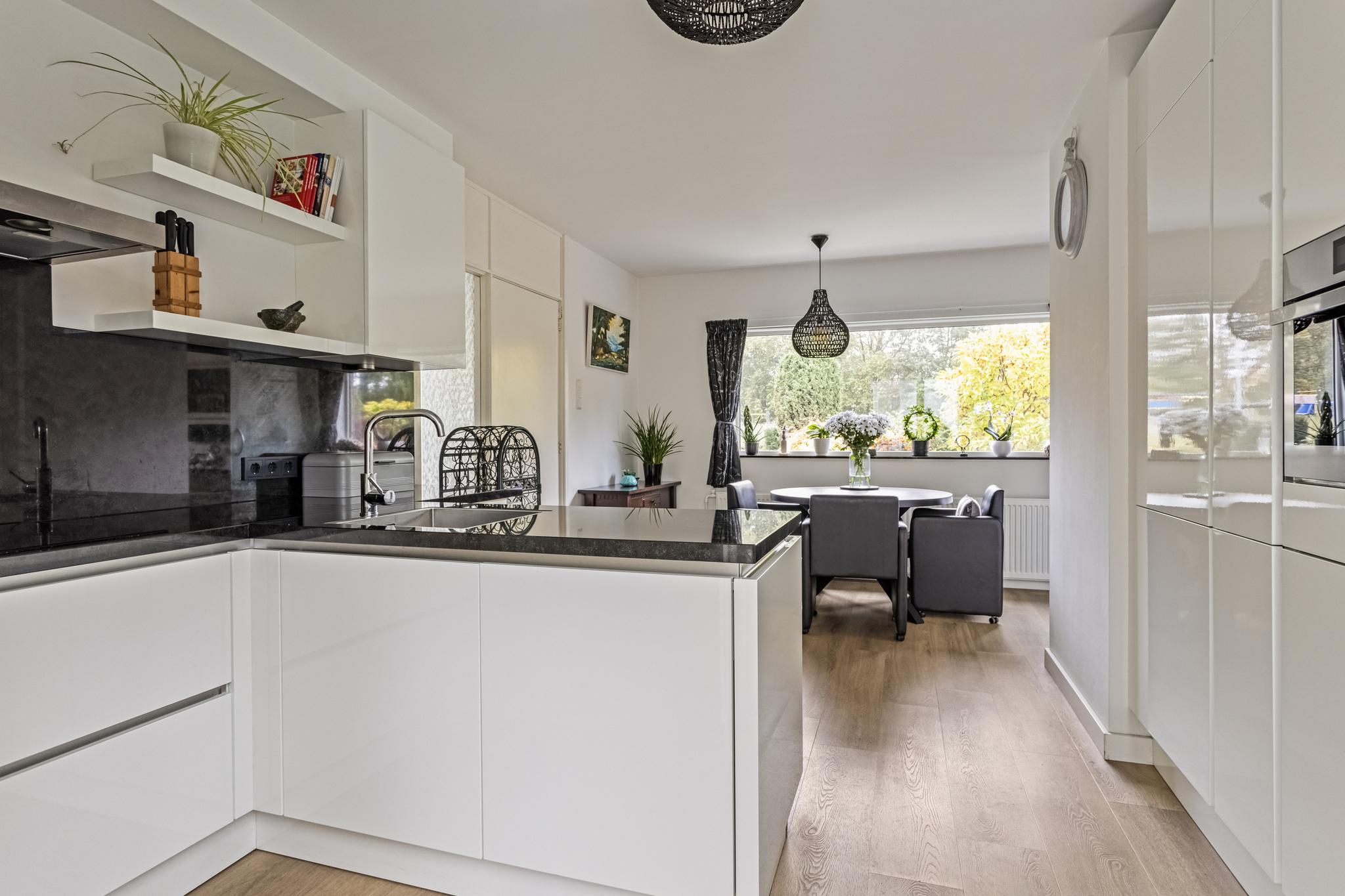 De moderne keuken is voorzien van pvc laminaatvloer en granieten werkblad, een kastenwand met o.a. een apothekerskast en diverse inbouwapparatuur: