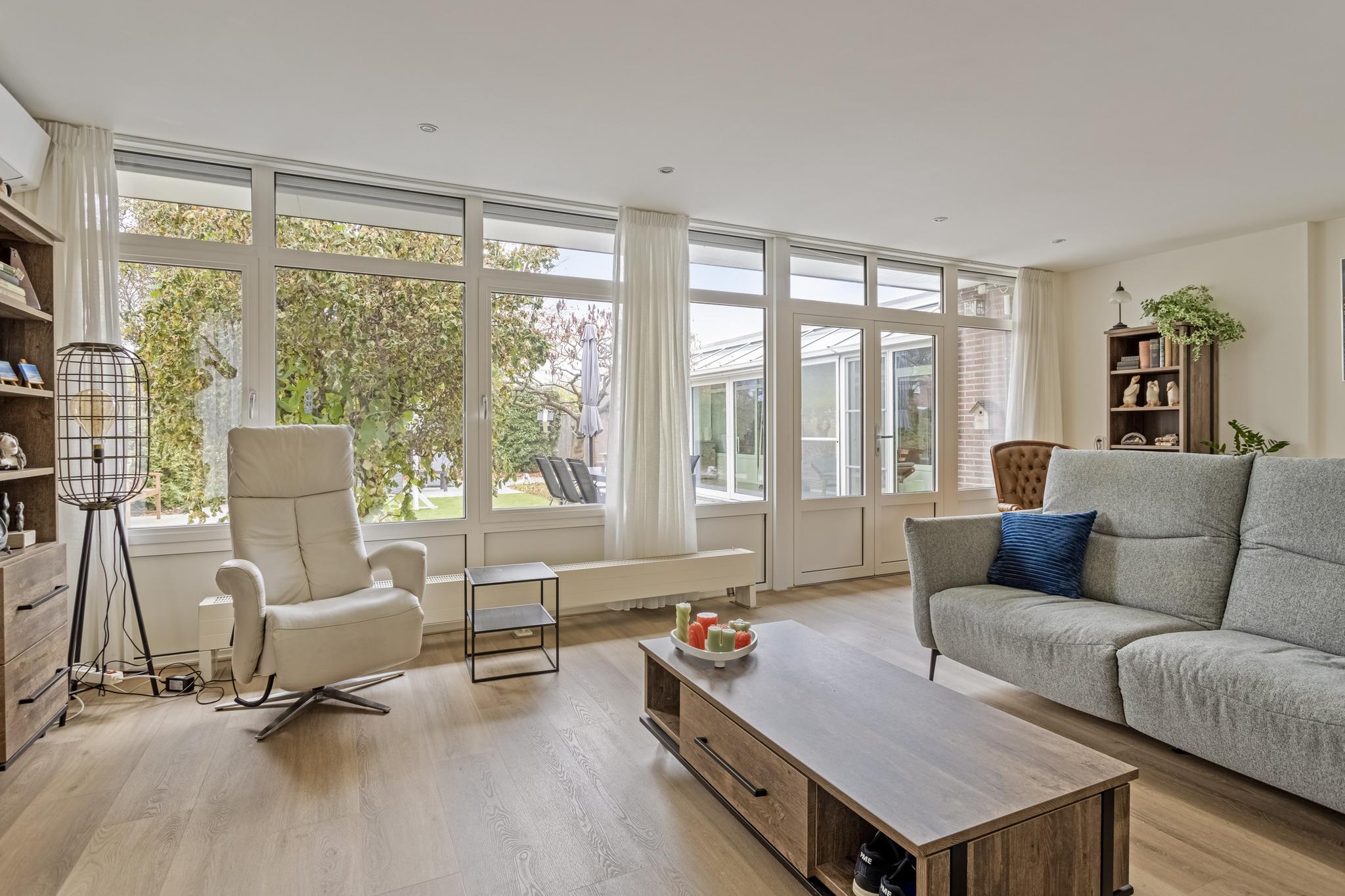 De woonkamer is voorzien van pvc laminaatvloer, airco-unit, open haard (niet in gebruik), inbouwspots en grote kiep/kantel ramen aan de tuinkant, zodat er veel natuurlijk daglicht de woonkamer binnen valt. De ramen zijn uitgerust met elektrische screens. Via de dubbele openslaande deuren is de tuin bereikbaar.