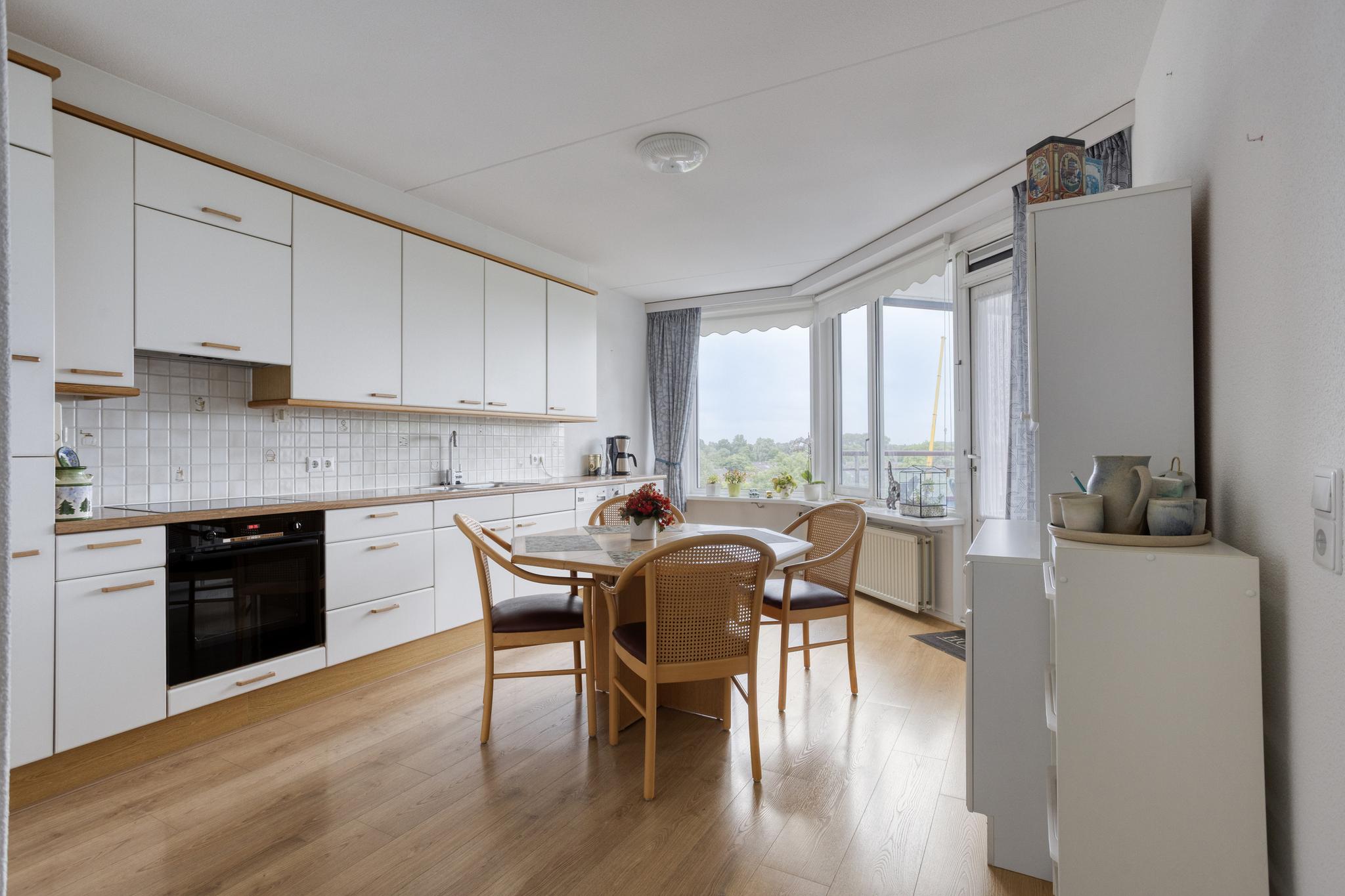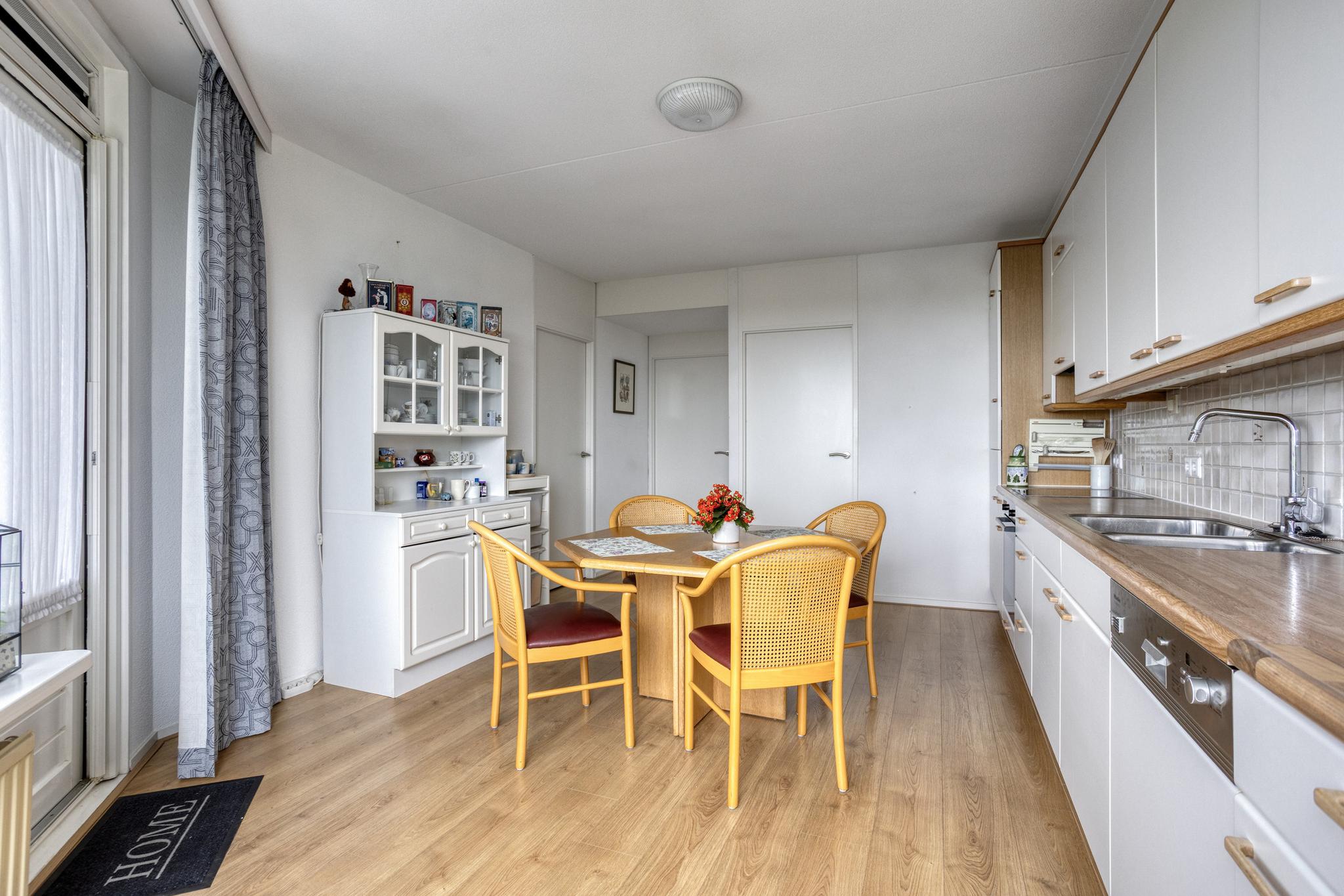 De dichte woonkeuken ligt in het verlengde van de woonkamer en is voorzien van laminaatvloer en voldoende boven- en onderkasten. Tevens is de keuken van alle gemakken voorzien qua inbouwapparatuur: