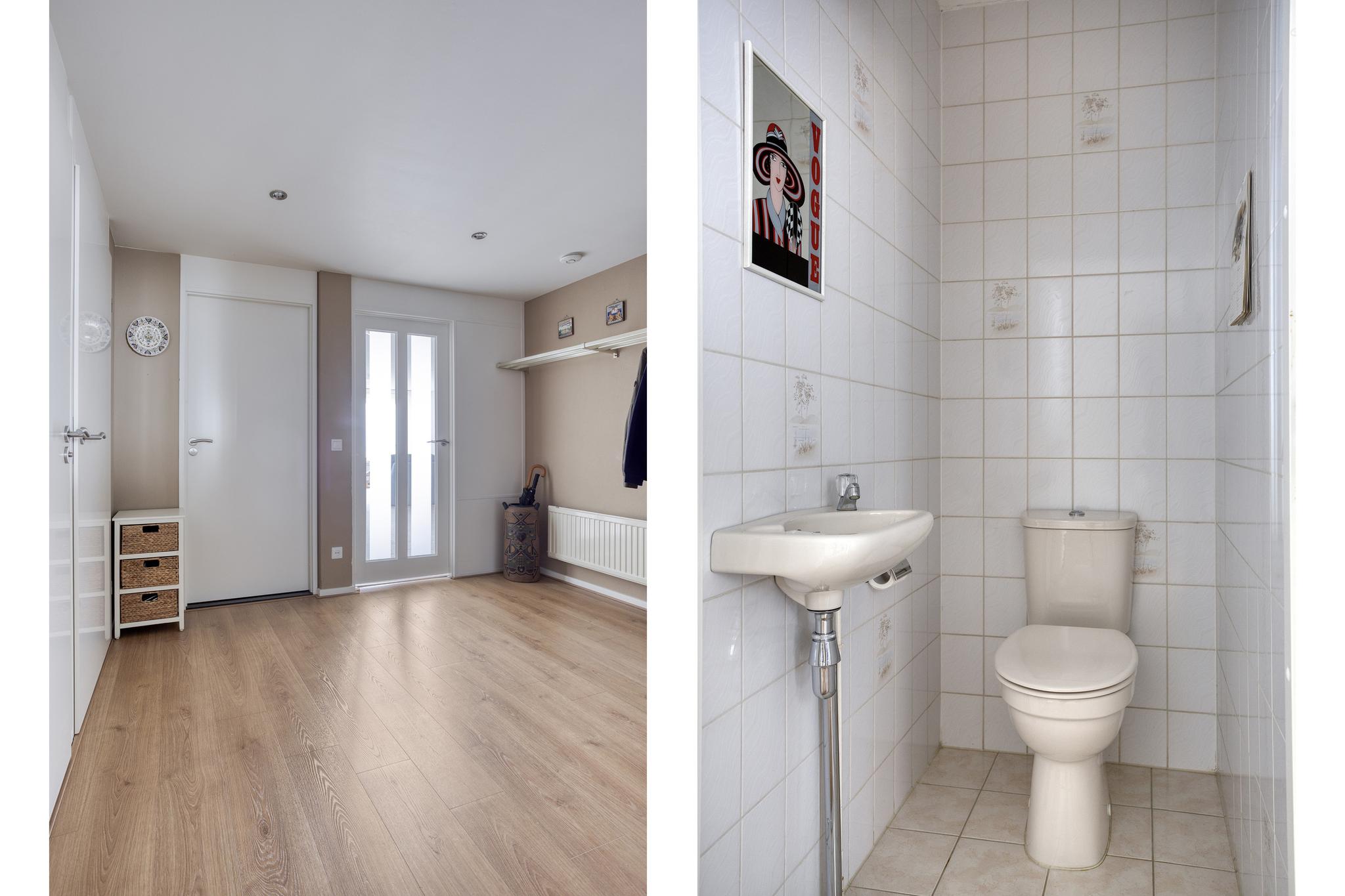 De ruime entree is voorzien van een laminaatvloer, garderoberuimte, toiletruimte, wasruimte én meterkast. De toiletruimte is geheel betegeld en voorzien van fontein. In de wasruimte hangt tevens de cv-combiketel.