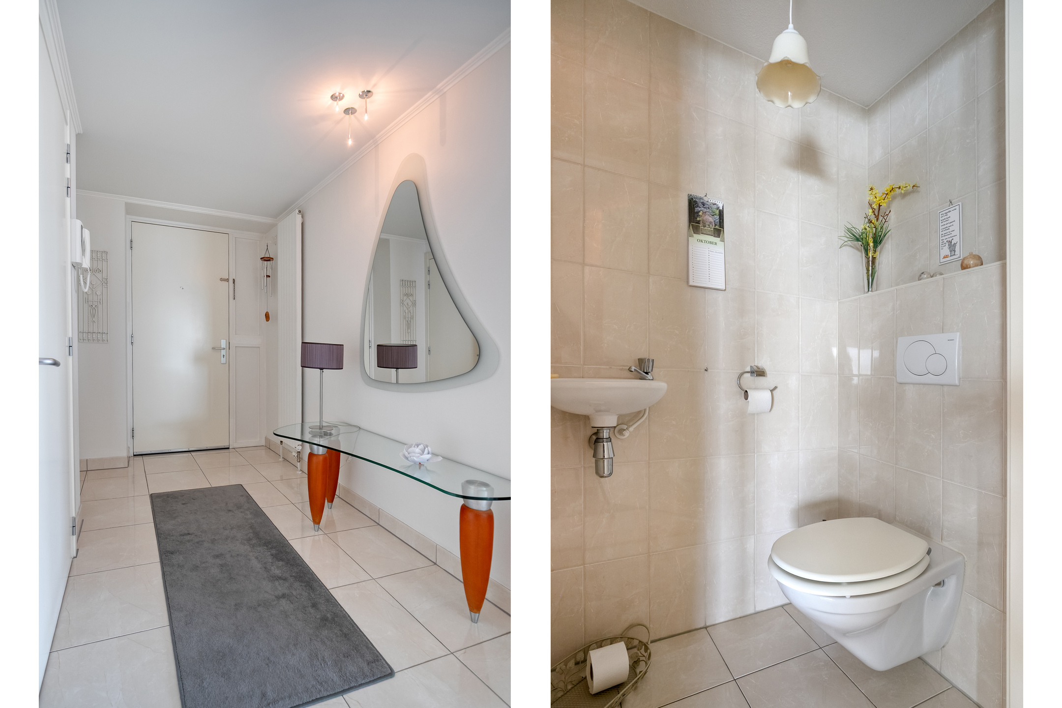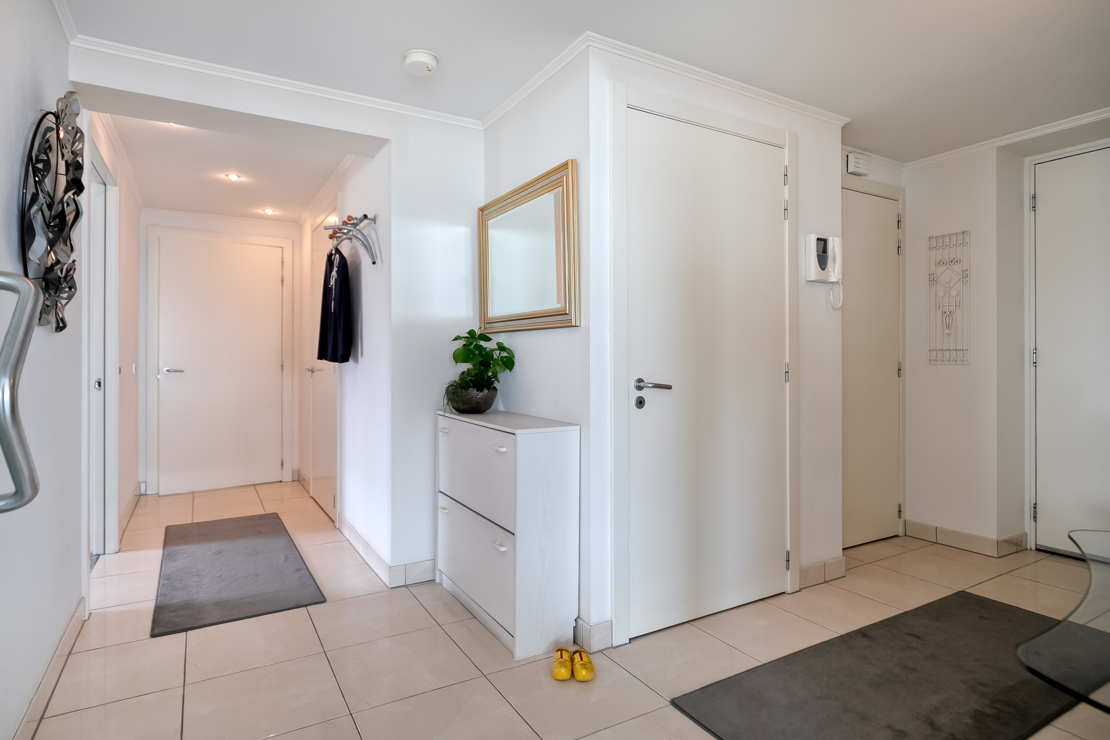 Bij binnenkomst betreed je een ruime hal die centraal ligt in het appartement en toegang biedt tot alle vertrekken. De hal is stijlvol afgewerkt met een tegelvloer, een spanplafond met ingebouwde spotverlichting, en beschikt over een meterkast en een modern toilet met fontein.