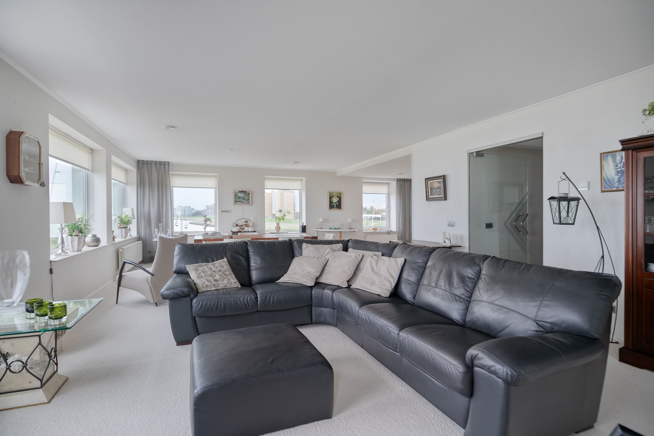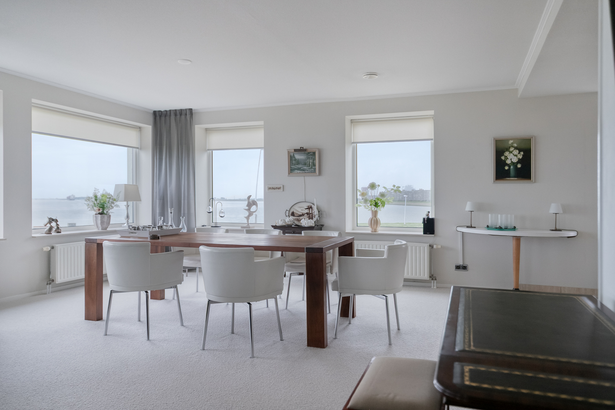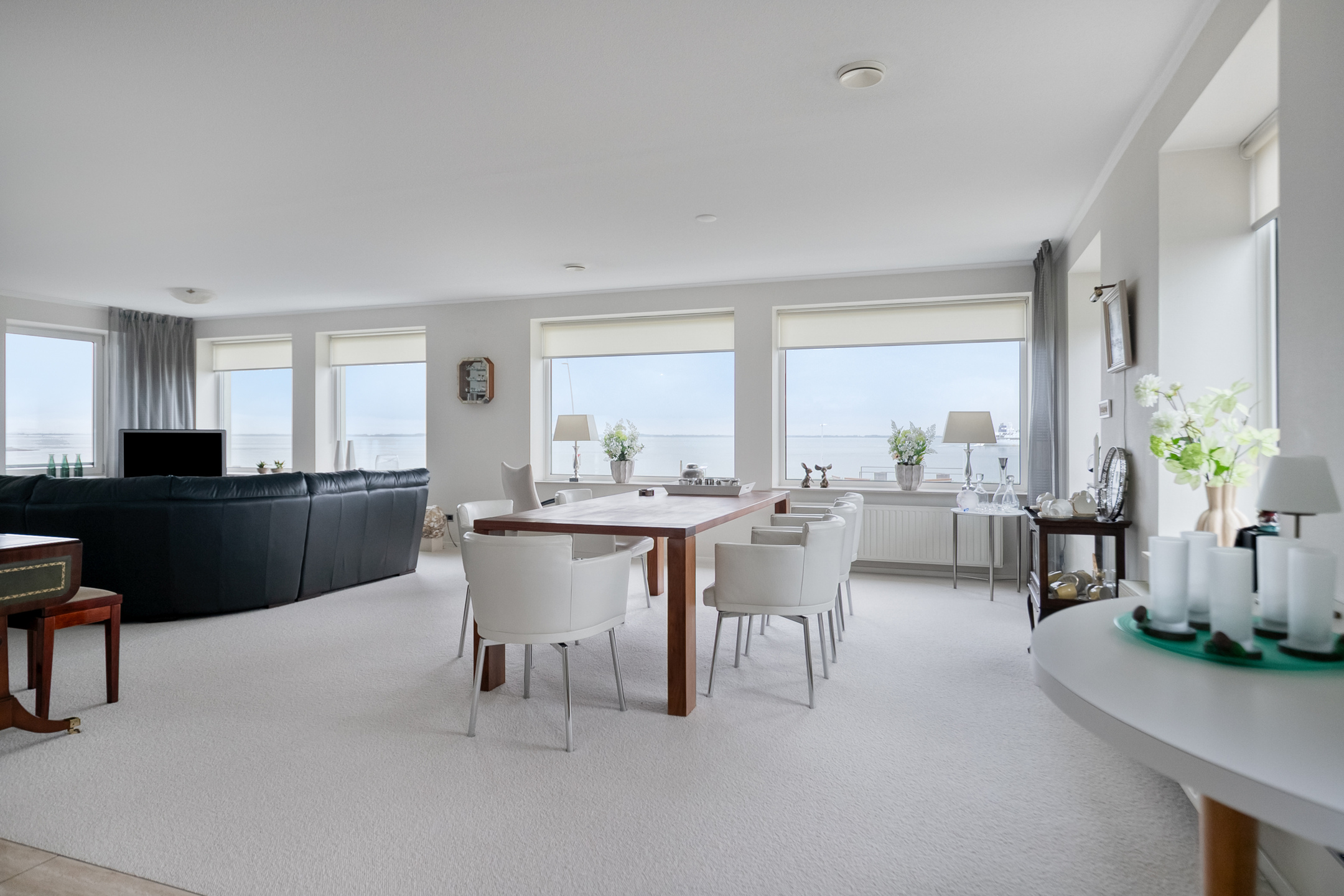 Via een elegante glazen deur kom je in de royale woonkamer met open keuken. Dankzij de grote raampartijen geniet je hier van een prachtig panoramisch uitzicht op de Westerschelde, met lichtinval vanuit het noorden, oosten en westen. Vanuit de woonkamer heb je directe toegang tot een ruim privébalkon, perfect om buiten te ontspannen met zicht op het water.