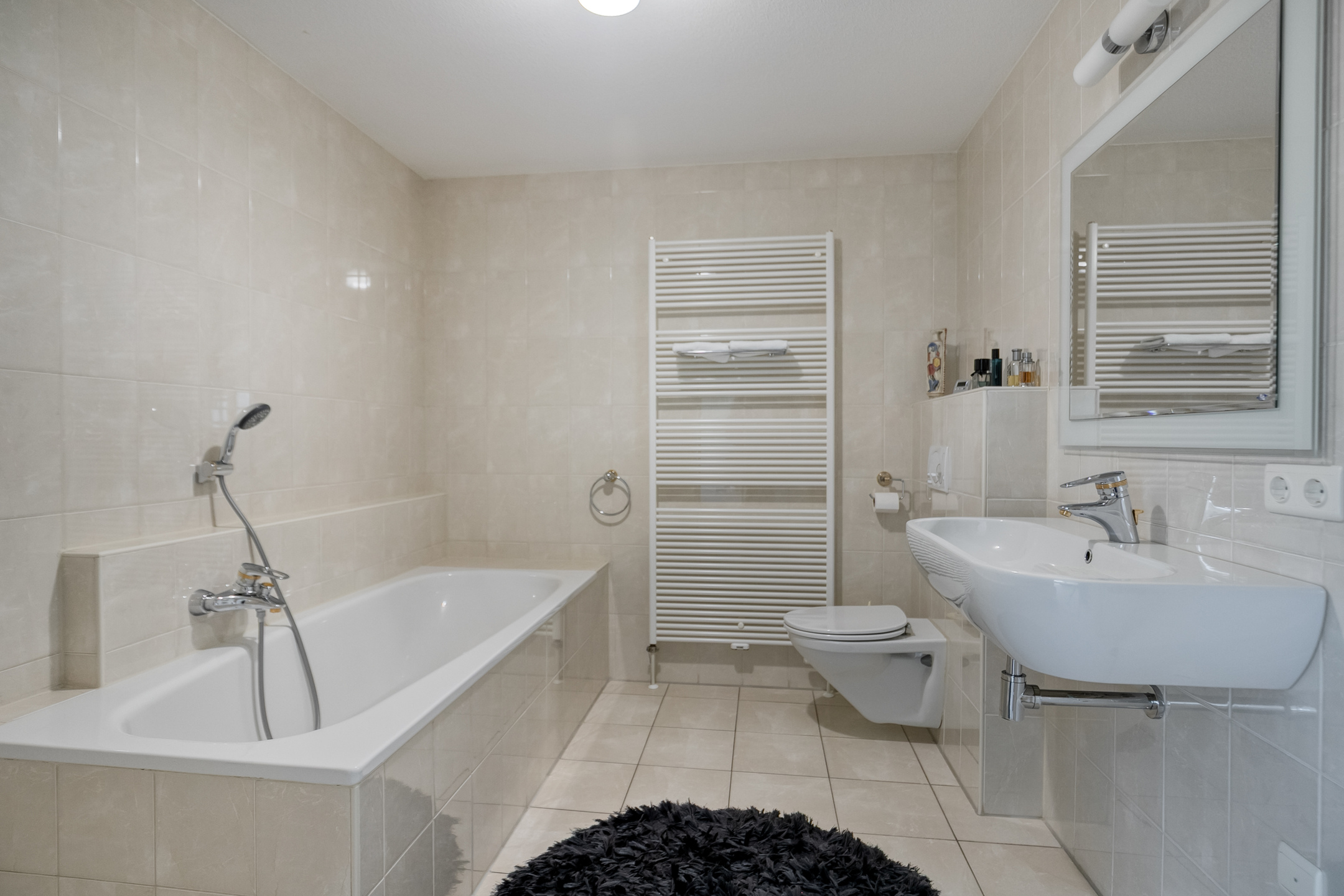 Het appartement heeft 2 ruime slaapkamers, beide voorzien van vloerbedekking. De master bedroom van ca 40m2 heeft een kastenwand over de gehele breedte van de kamer en directe toegang tot de badkamer. De badkamer is volledig betegeld en uitgerust met een ligbad, douche, toilet, een grote wastafel en handdoekenradiator.